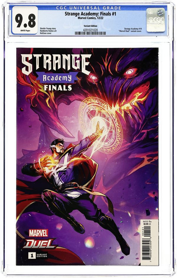 Written by Skottie Young. Art by Humberto Ramos. Cover by Neatease. FRESHMAN YEAR IS ALMOST OVER! From day one, people have been wondering - who is the savior of Strange Academy, and who can bring it all down? The future of Marvel Magic is going to be decided here and it will take FAR more than the Sorcerer Supreme and his school if magic has a chance! 28 pages, full color, rated T+ Cover price $3.99.