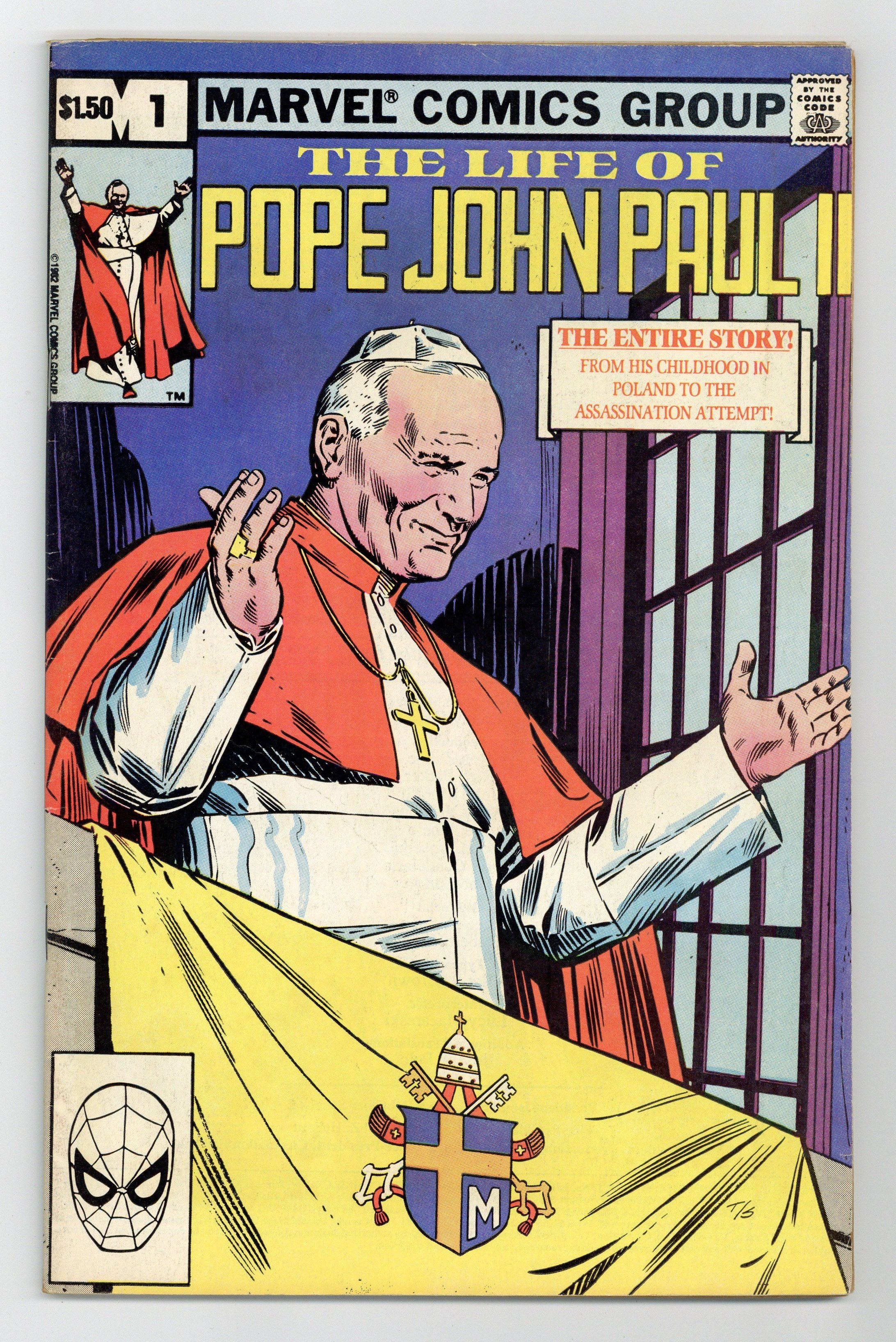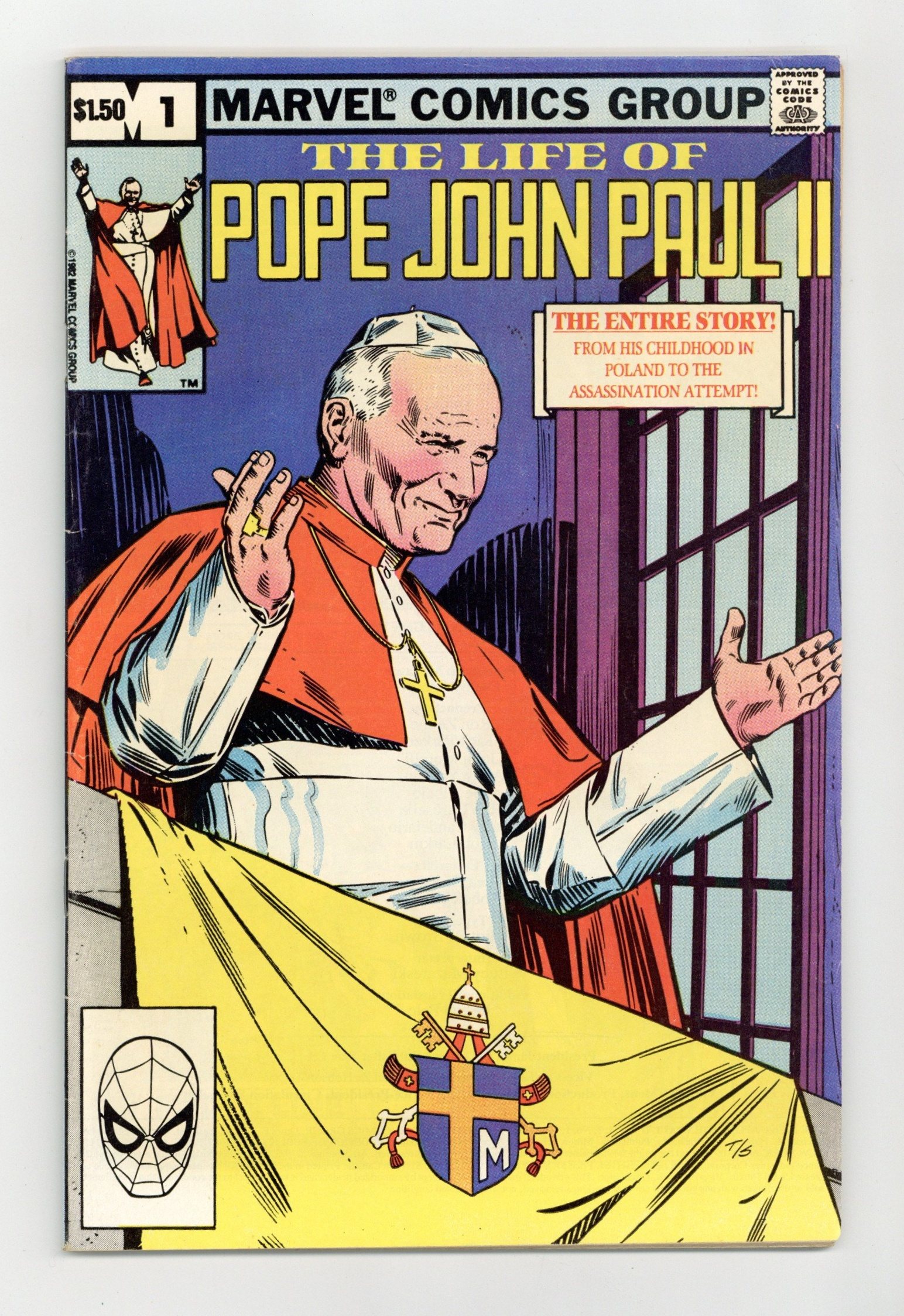 $18.00Direct Edition. Written by Steven Grant, plus an introduction by Cardinal Jose Saraiva Martins. Art and cover by John Tartaglione. Marvel commissioned this ad-free title, one of the earliest biographical comics from a mainstream publisher, shortly after the ordination of John Paul II. Father Mieczyslaw Malinski, a lifelong friend of the first non-Italian pope, and two Marvel staffers present the Popes life story, including his youth in Poland, his support of the Resistance during World War II, and the unsuccessful attempt on his life in 1981. 64 pages, Full Color. Cover price $1.50.