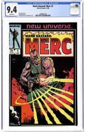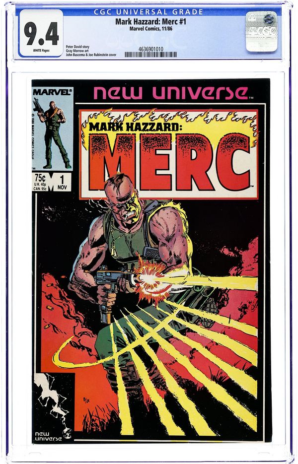 "Bad for Business!" Story by Peter David. Art by Gray Morrow. It's a world not unlike our own. Words like paranormal or super-hero are euphemisms only used in comic books and movies. That was until the White Event! In one blinding moment the landscape of the universe changed. Welcome to the New Universe. In a world that has been turned upside down, one man is determined to see to business as usual. Meet Marc Hazzard, professional mercenary. The only problem is it's hard to be a cold-blooded gun for hire when you have something to lose. Cover price $1.00.