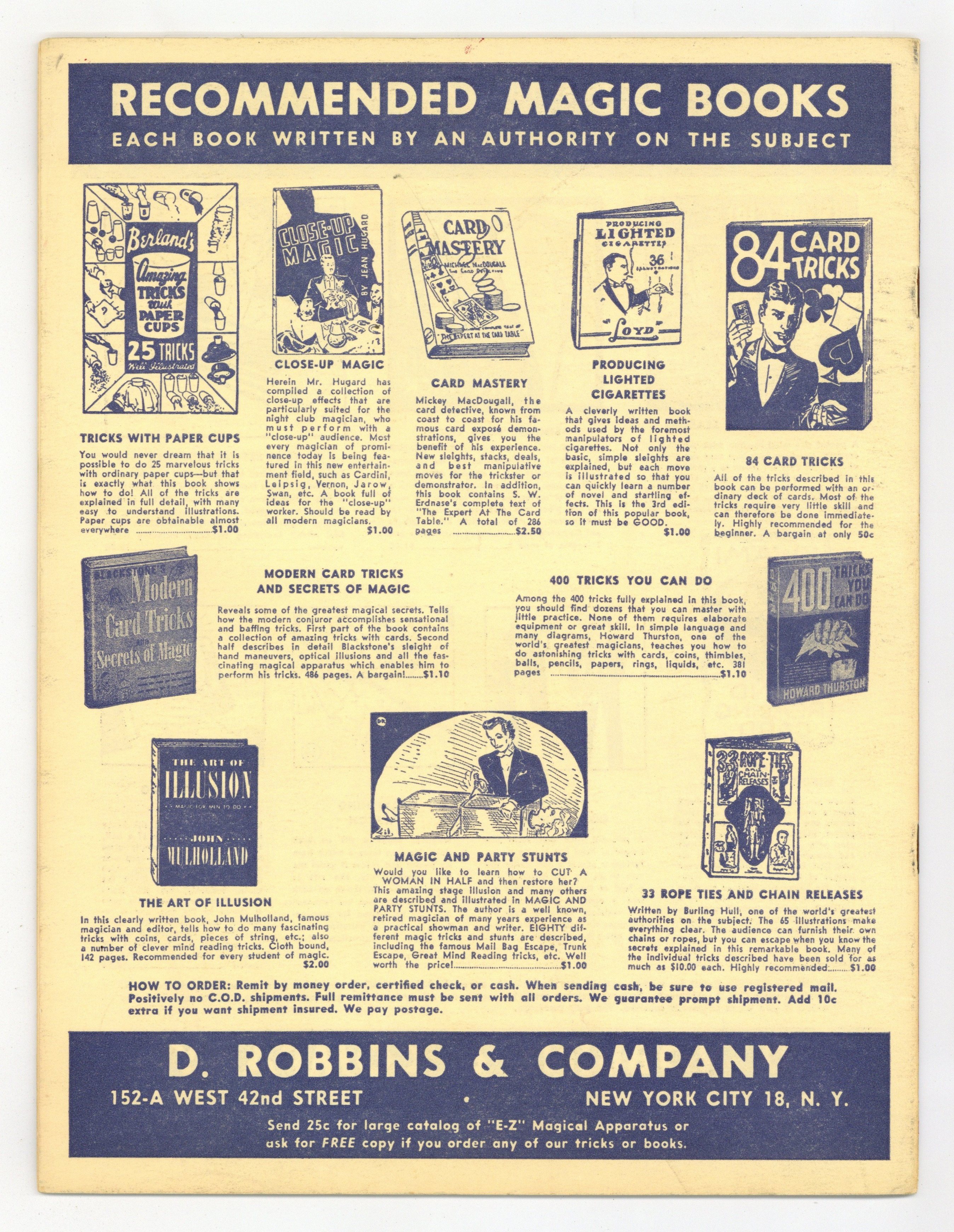 Published Apr 1946 by D. Robbins and Co..$45.00The independent magazine for the amateur magician. 8" x 10.5", 24 pages, B&W. Cover price $0.25.