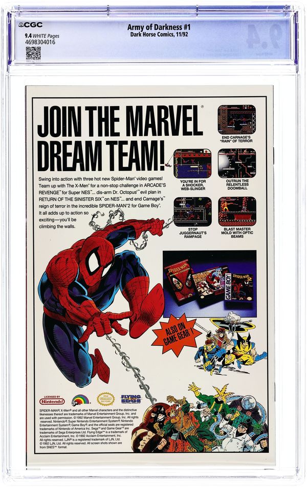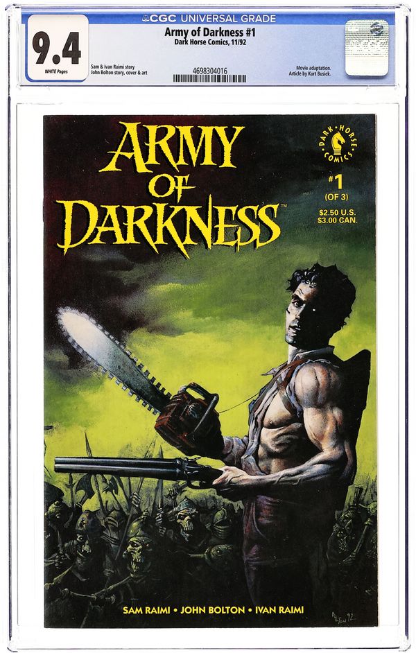 Written by Sam Raimi and Ivan Raimi. Art and cover by John Bolton. "Who's laughing now?" Not Ash, the hero of Sam Raimi's cult-classic film Evil Dead II. Armed with his chainsaw and shotgun, Ash finds himself stranded in the Middle Ages battling the resurrected armies of the dead! 32 pages, FC. Cover price $2.50.