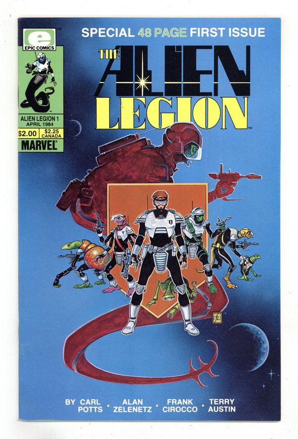 Published Apr 1984 by Marvel/Epic.$4.50"Survival of the Fittest!" Created by Carl Potts. Written by Alan Zelenetz. Art by Frank Cirocco and Terry Austin. Cover by Frank Cirocco. Footsloggers and soldiers of fortune, priests and poets, killers and cads - they fight for a future Galarchy, for cash, a cause, for the thrill of adventure. Legionnaires live rough and they die hard, tough as tungsten and loyal to the dirty end. Includes bios for Montroc, Sarigar, Grimrod, Durge, Meico and Dun. 48 pages, FC. Cover price $2.00.
