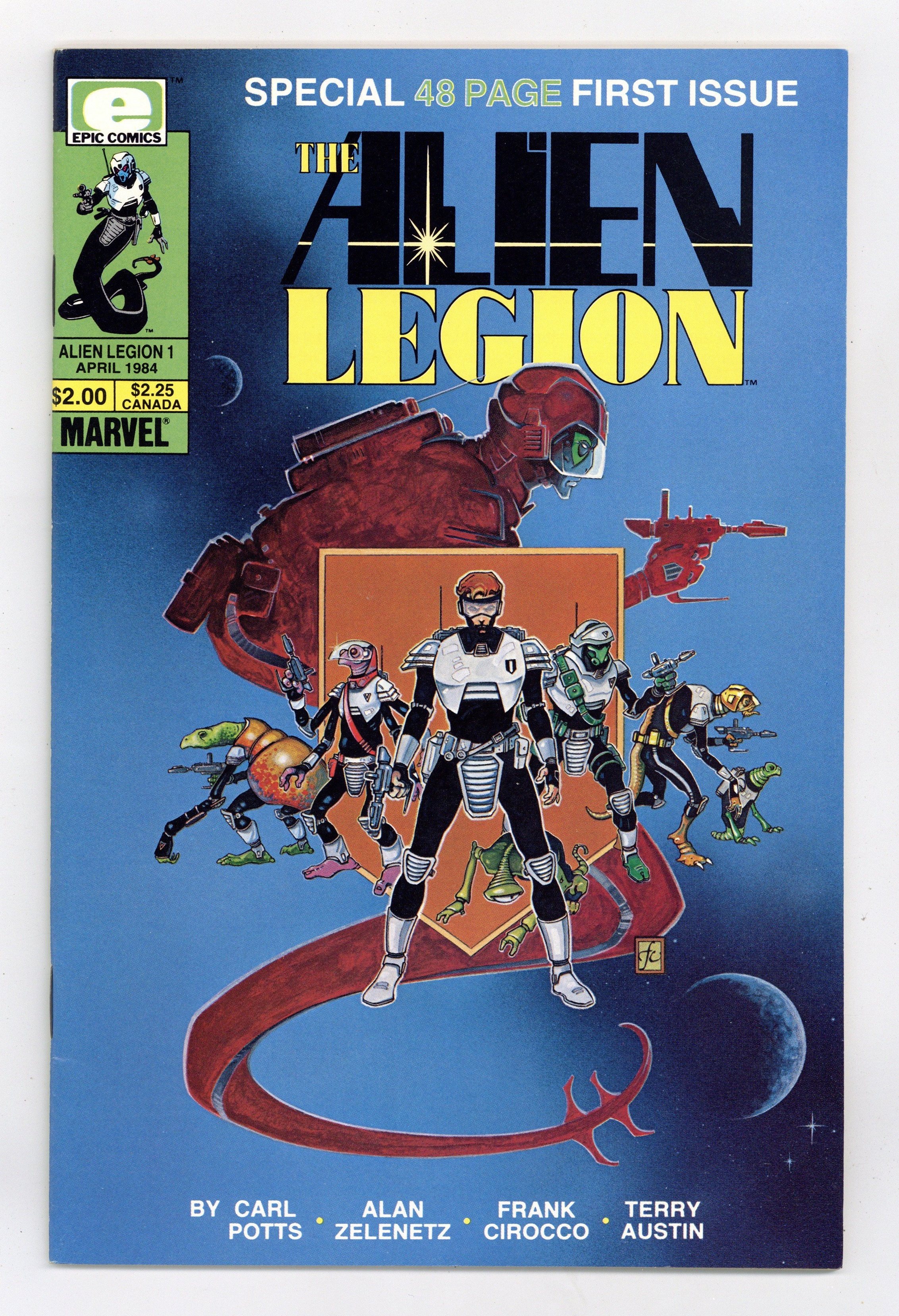 Published Apr 1984 by Marvel/Epic.$7.00"Survival of the Fittest!" Created by Carl Potts. Written by Alan Zelenetz. Art by Frank Cirocco and Terry Austin. Cover by Frank Cirocco. Footsloggers and soldiers of fortune, priests and poets, killers and cads - they fight for a future Galarchy, for cash, a cause, for the thrill of adventure. Legionnaires live rough and they die hard, tough as tungsten and loyal to the dirty end. Includes bios for Montroc, Sarigar, Grimrod, Durge, Meico and Dun. 48 pages, FC. Cover price $2.00.