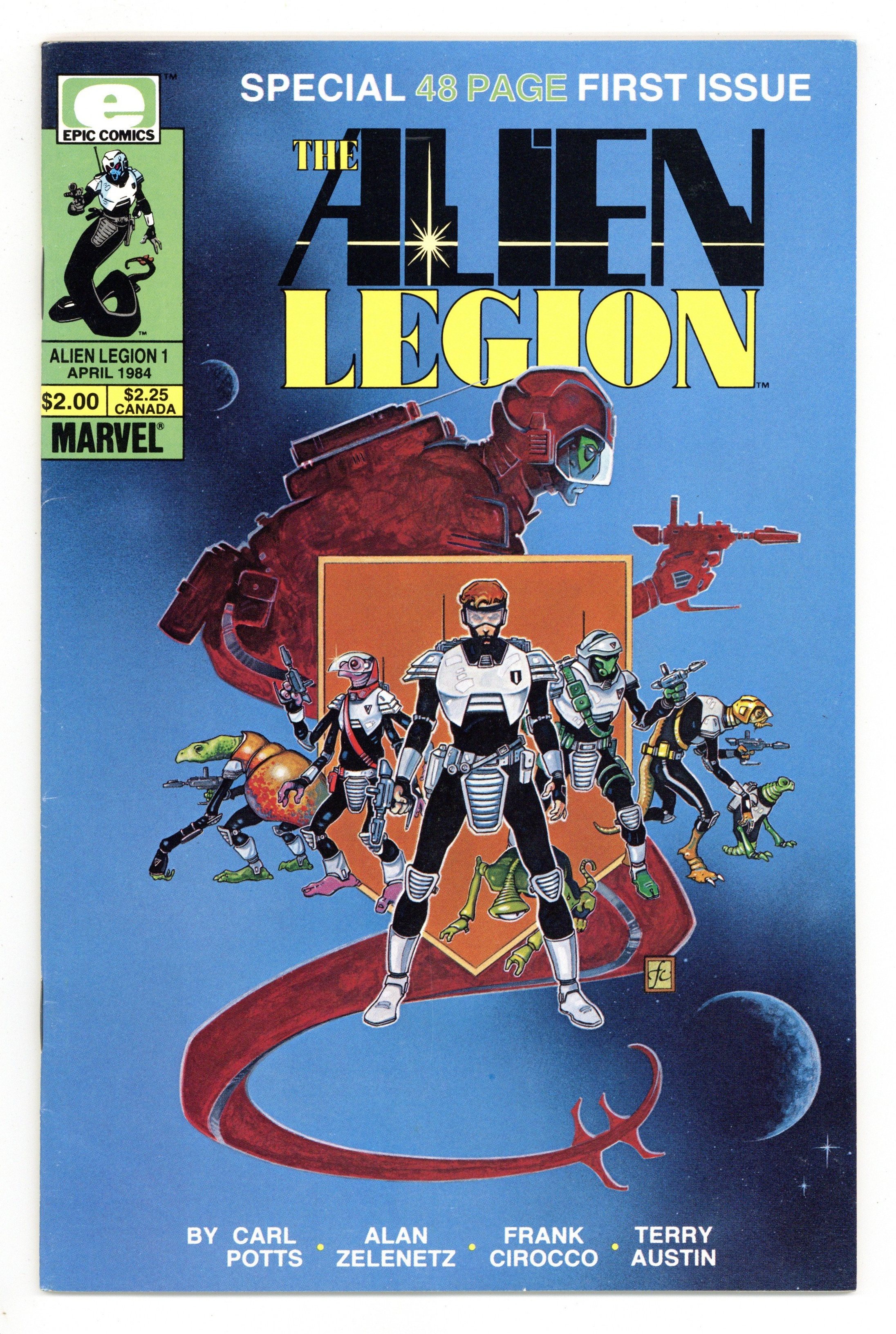 Published Apr 1984 by Marvel/Epic.$10.00"Survival of the Fittest!" Created by Carl Potts. Written by Alan Zelenetz. Art by Frank Cirocco and Terry Austin. Cover by Frank Cirocco. Footsloggers and soldiers of fortune, priests and poets, killers and cads - they fight for a future Galarchy, for cash, a cause, for the thrill of adventure. Legionnaires live rough and they die hard, tough as tungsten and loyal to the dirty end. Includes bios for Montroc, Sarigar, Grimrod, Durge, Meico and Dun. 48 pages, FC. Cover price $2.00.