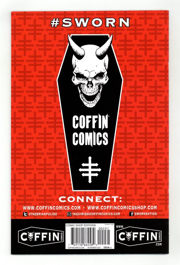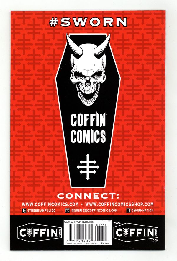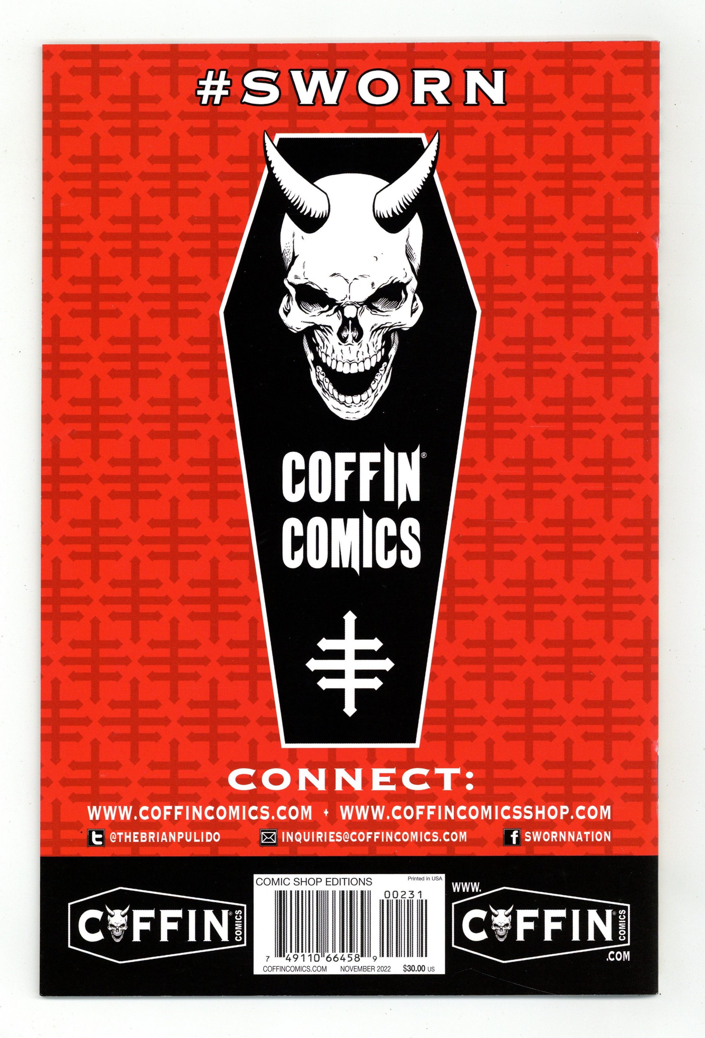 Published Nov 2022 by Coffin Comics.$12.00Written by Brian Pulido, Mike MacLean. Art by Diego Bernard. Cover by Sorah Suhng. 'Deathocalypse', an official year-long company-wide event, climaxes here! Round one went to Lady Death after she dropped Hellwitch into a vat of flesh-eating toxic waste. Round two went to Hellwitch, who savagely stabbed Lady Death's eye. Now, bear witness to their outrageously brutal third and final round set in Sin City itself, Las Vegas! For months, Hellwitch weaved a twisted plot to first seduce Lady Death with forbidden lust and then snare her into a lethal confrontation. But her carefully-crafted scheme devolves into an orgy of bone-shattering violence and neither of these warrior women will ever be the same. Who will reign supreme in one of the most savage, action-packed slugfests in comic book history? 32 pages, full color. Cover price $30.00.