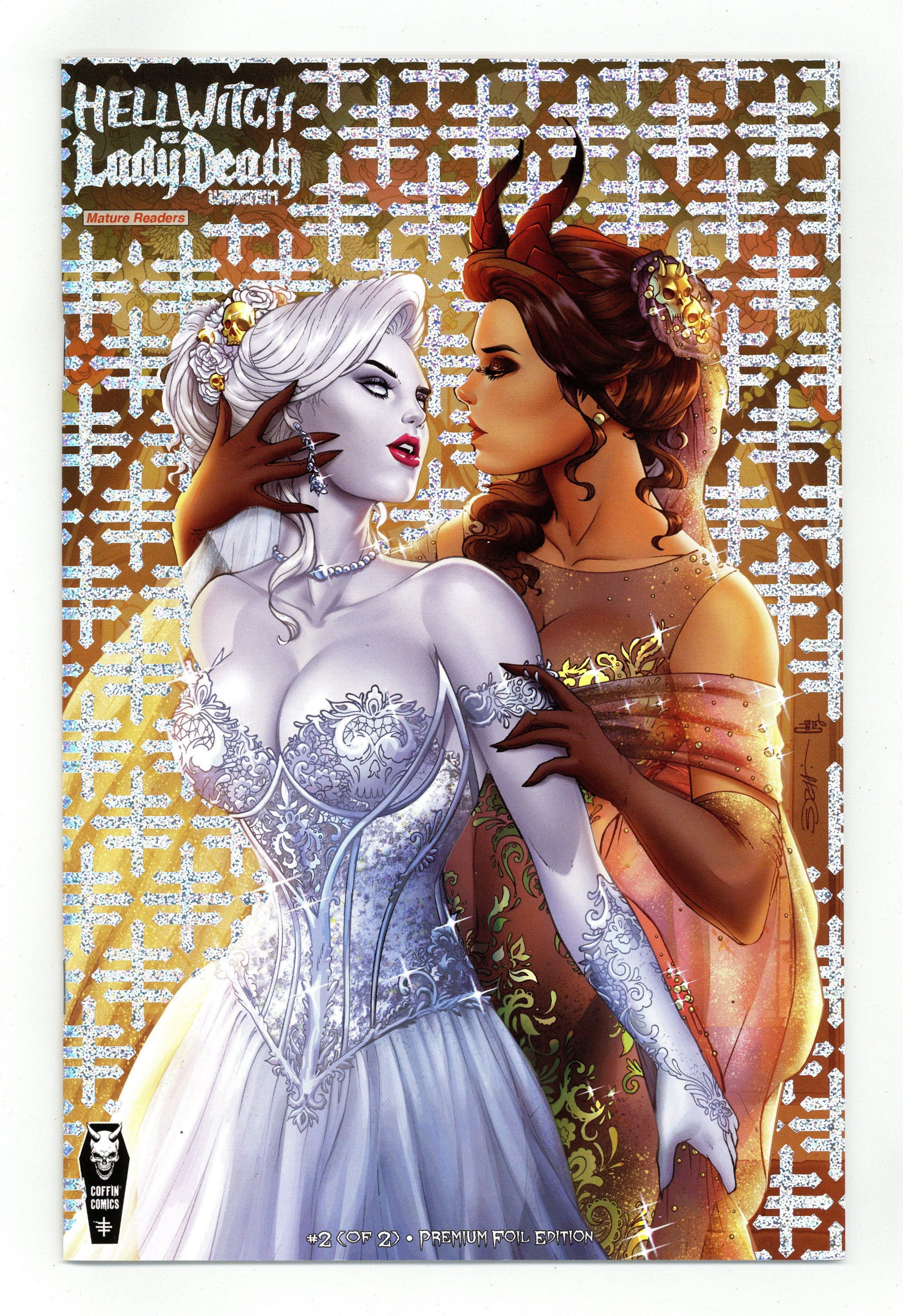 Published Nov 2022 by Coffin Comics.$14.00Written by Brian Pulido, Mike MacLean. Art by Diego Bernard. Cover by Sorah Suhng. 'Deathocalypse', an official year-long company-wide event, climaxes here! Round one went to Lady Death after she dropped Hellwitch into a vat of flesh-eating toxic waste. Round two went to Hellwitch, who savagely stabbed Lady Death's eye. Now, bear witness to their outrageously brutal third and final round set in Sin City itself, Las Vegas! For months, Hellwitch weaved a twisted plot to first seduce Lady Death with forbidden lust and then snare her into a lethal confrontation. But her carefully-crafted scheme devolves into an orgy of bone-shattering violence and neither of these warrior women will ever be the same. Who will reign supreme in one of the most savage, action-packed slugfests in comic book history? 32 pages, full color. Cover price $30.00.