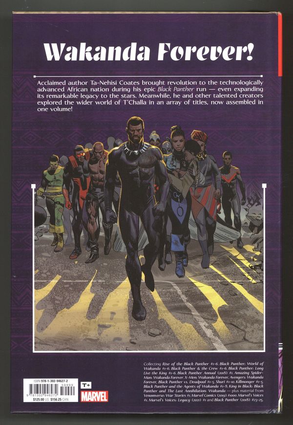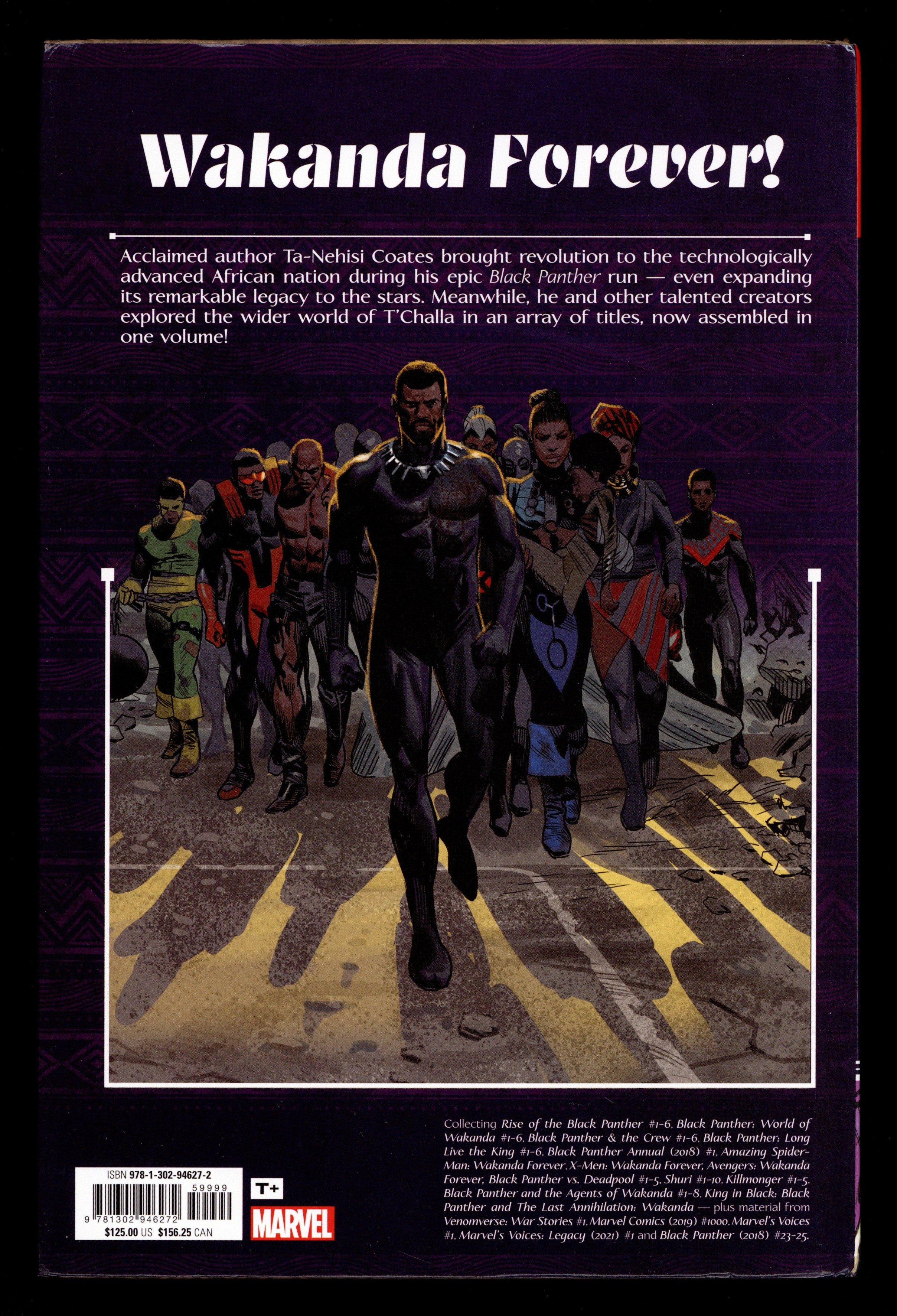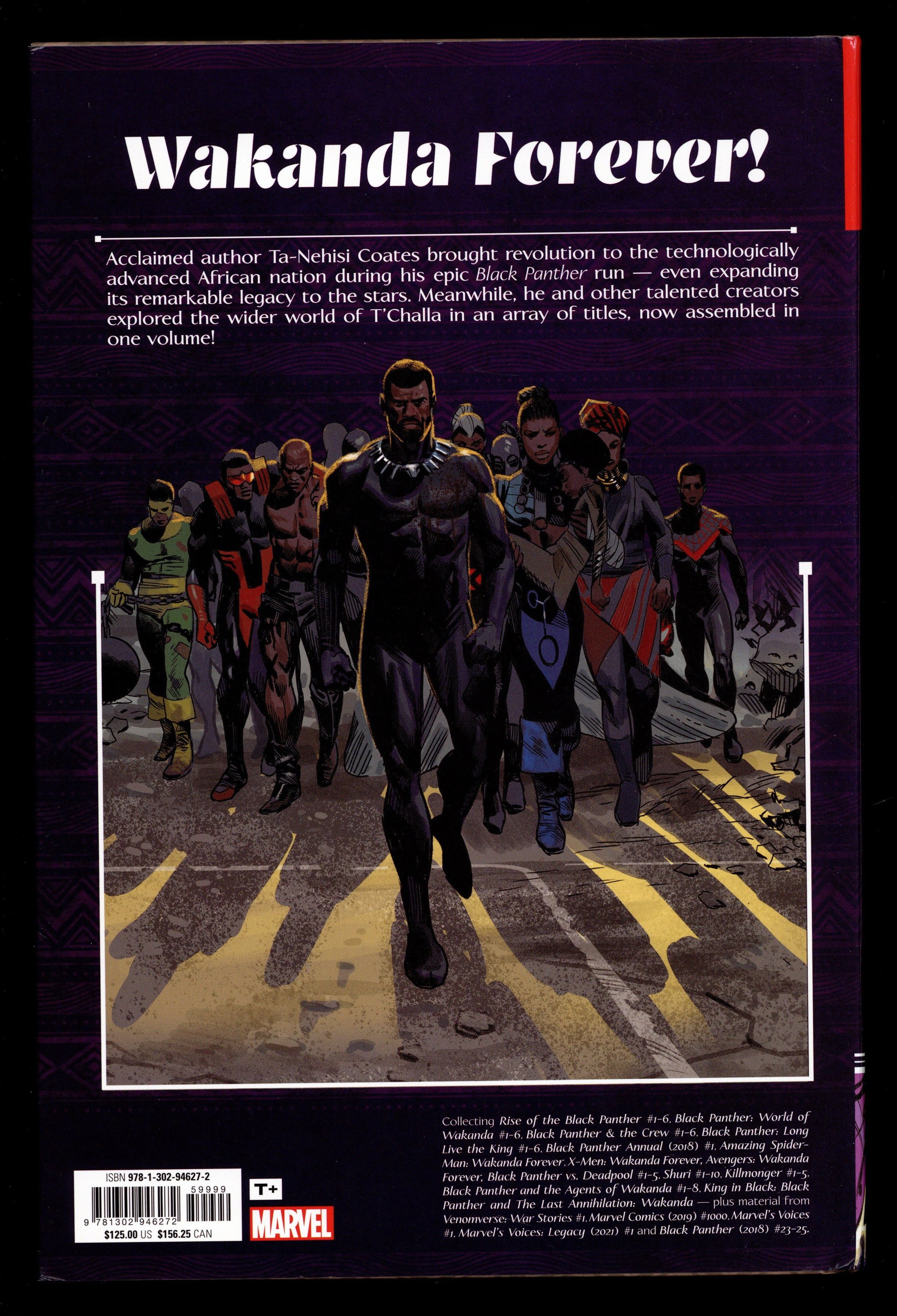 1st printing. Collects Rise of the Black Panther (2018) #1-6, Black Panther: World of Wakanda (2016) #1-6, Black Panther and the Crew (2017) #1-6, Black Panther: Long Live the King TPB (2018 Marvel) A Marvel Premiere Graphic Novel, Black Panther (2017 6th Series) Annual #1, Wakanda Forever: Amazing Spider-Man (2018) , Wakanda Forever: X-Men (2018), Wakanda Forever: Avengers (2018), Black Panther vs. Deadpool (2018) #1-5, Shuri (2018) #1-10, Killmonger (2018) #1-5, Black Panther and the Agents of Wakanda (2019 Marvel) #1-8, King in Black: Black Panther (2021 Marvel) and The Last Annihilation: Wakanda (2021 Marvel) - plus material from Venomverse: War Stories (2017), Marvel Comics (2019 Marvel) #1000, Marvel's Voices (2020 Marvel), Marvel's Voices Legacy (2021 Marvel) and Black Panther (2018 7th Series) #23-25.