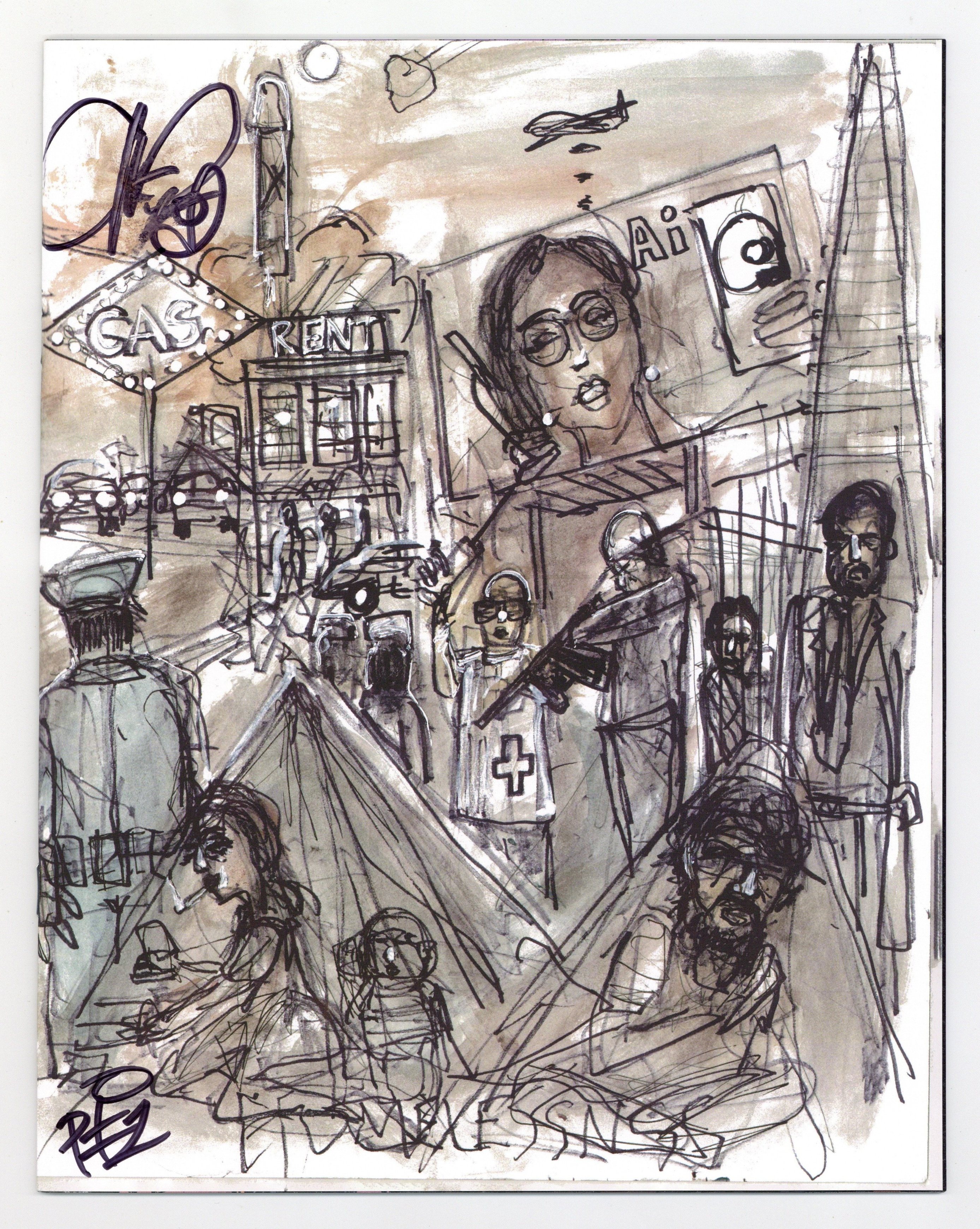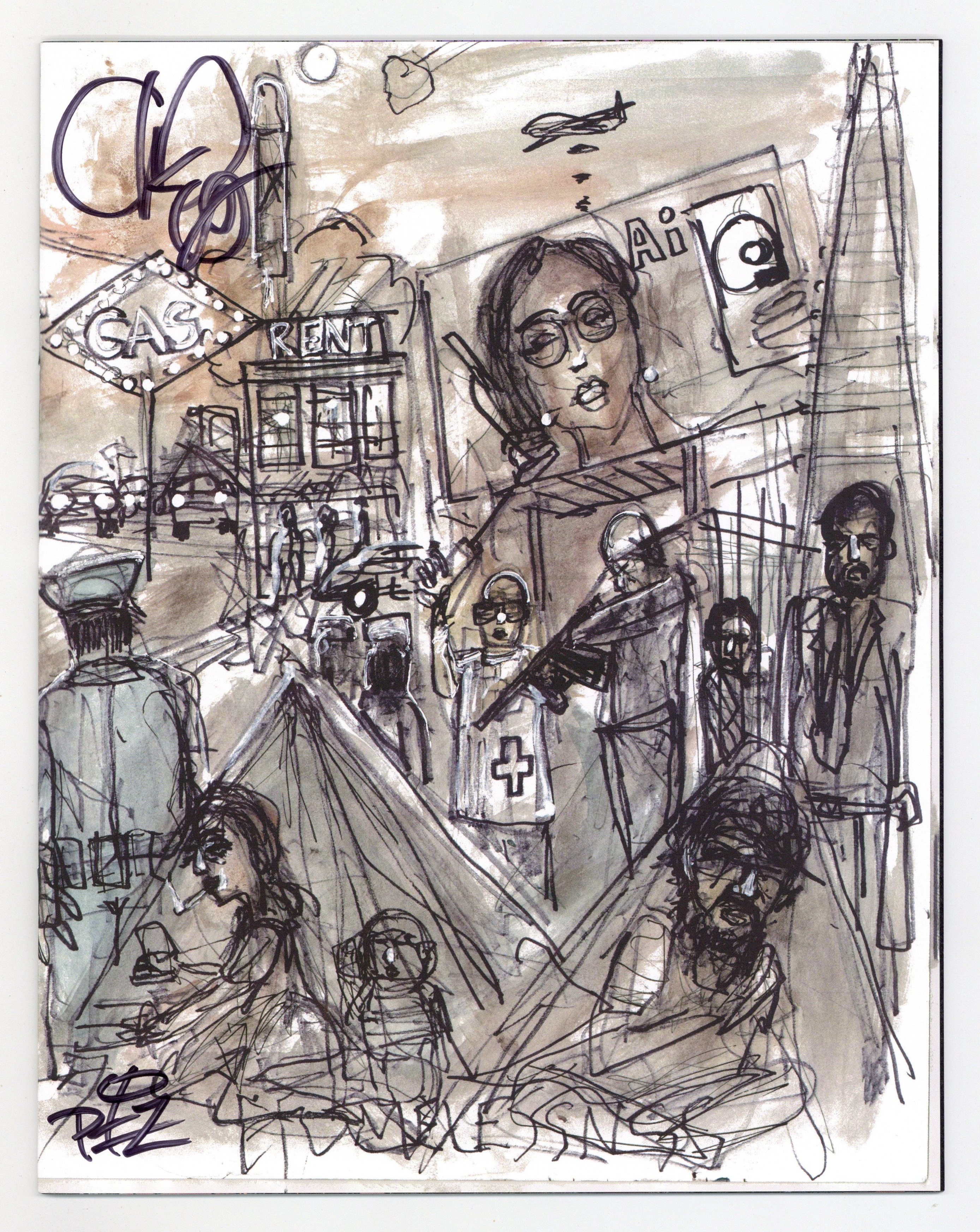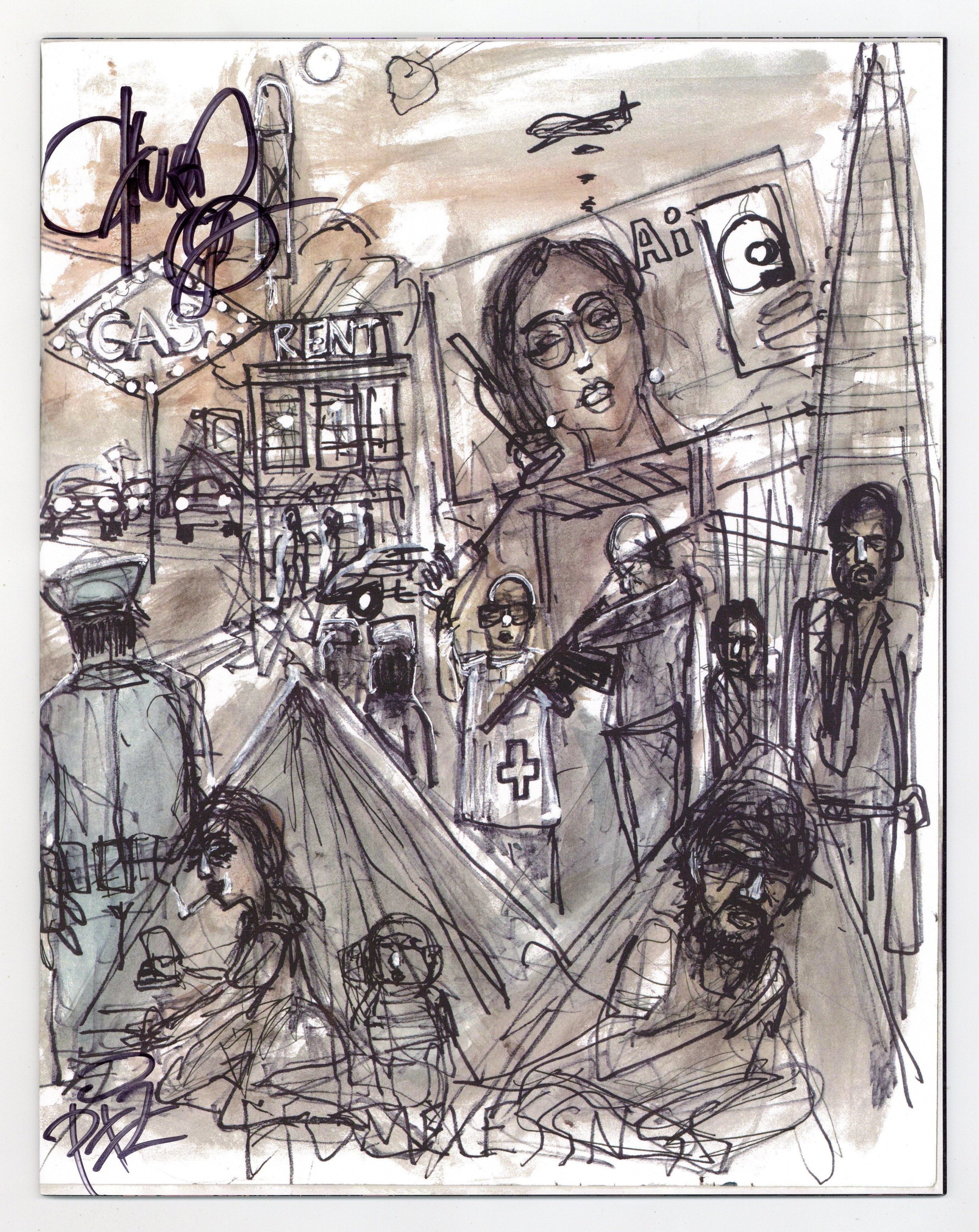Written by Matteo Pizzolo. Art by Carlos Granda. Cover by Chuck D. What if a contested Presidential election plunged America into turmoil? What if political violence consumed the streets? And what if a raging Supreme Court, in a strict interpretation of the 2nd Amendment, legitimized and deputized all militias, transforming the entire country into a paramilitary police state? What if a freedom fighter emerged from the chaos, raised a civilian army, and carved out a territory across the United States?… pushing out police, militias, and National Guard… enforcing its own laws… Sovereign. What if Americans refused to be governed? In this speculative fiction comic book series ripped from tomorrow's headlines, a mysterious figure named Vya Of Brightstars will rise from the crisis, but is she a freedom fighter or a terrorist? Either way, her rogue state will not just blaze a path across America, it will also inspire others to raise their own armies... some in solidarity, others in opposition. 'ROGUE STATE... is a genre known as 'speculative fiction.' Except that it doesn't seem as speculative anymore.' (-The San Francisco Chronicle) From writer Matteo Pizzolo (CALEXIT, GODKILLER) and artist Carlos Granda (PIROUETTE, CALEXIT: SAN DIEGO), comes this tale of rebelling against tyranny, reconquering stolen land, punching fascists in the face, and building a better nation. 32 pages, full color. Rated mature Cover price $9.99.