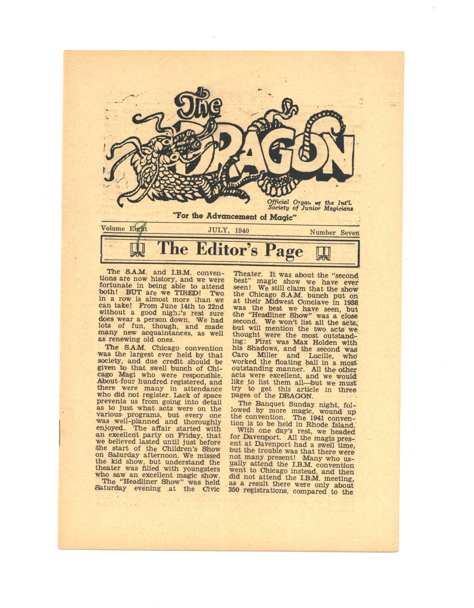Published Jul 1940 by International Society of Junior Magicians.$19.00Official organ of the International Society of Junior Magicians, containing news and tips. 16 pages on newsprint. This issue is mislabeled as Volume 8, but 1940 is actually volume 9.