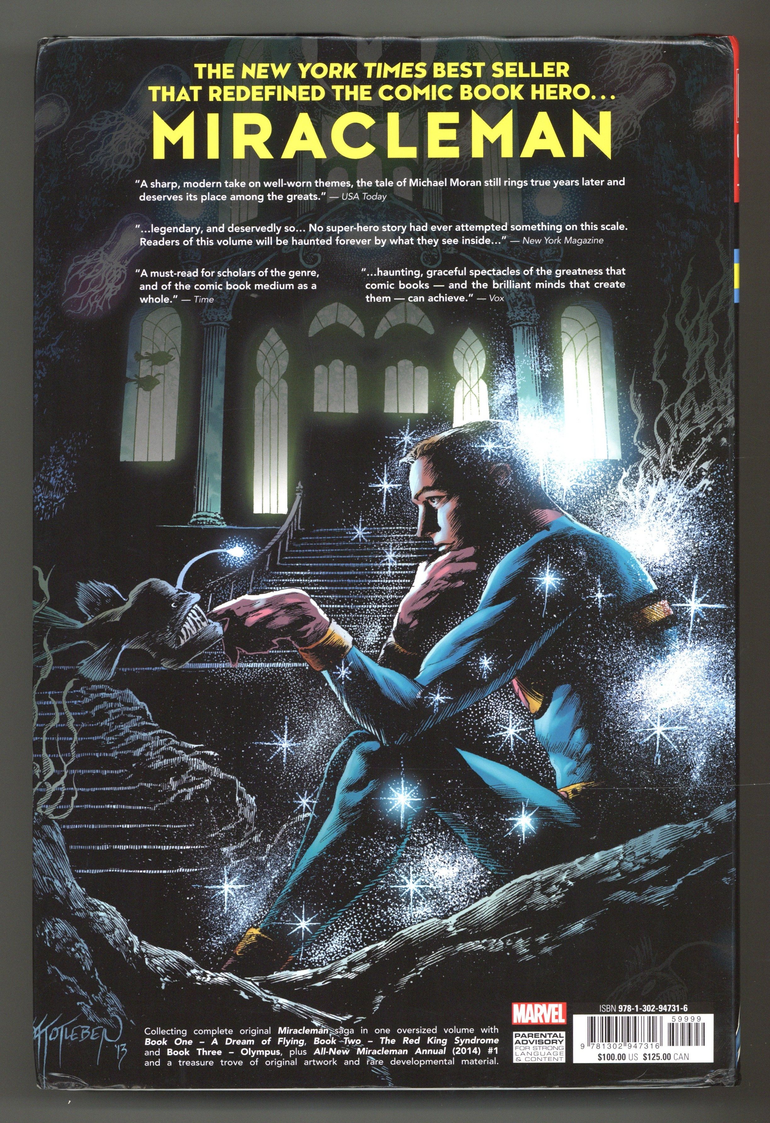 1st printing. Collects Miracleman (2014) #1-16 (originally released as Miracleman (1985-1993) #1, 3 and 6-16; Marvelman Special (1984), and material from A1 (1989 Atomeka) #1 and Warrior (1982 Quality) UK #1-18 and 20-21) and All New Miracleman Annual (2015) #1.