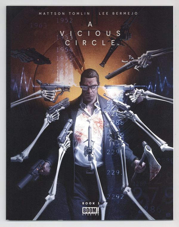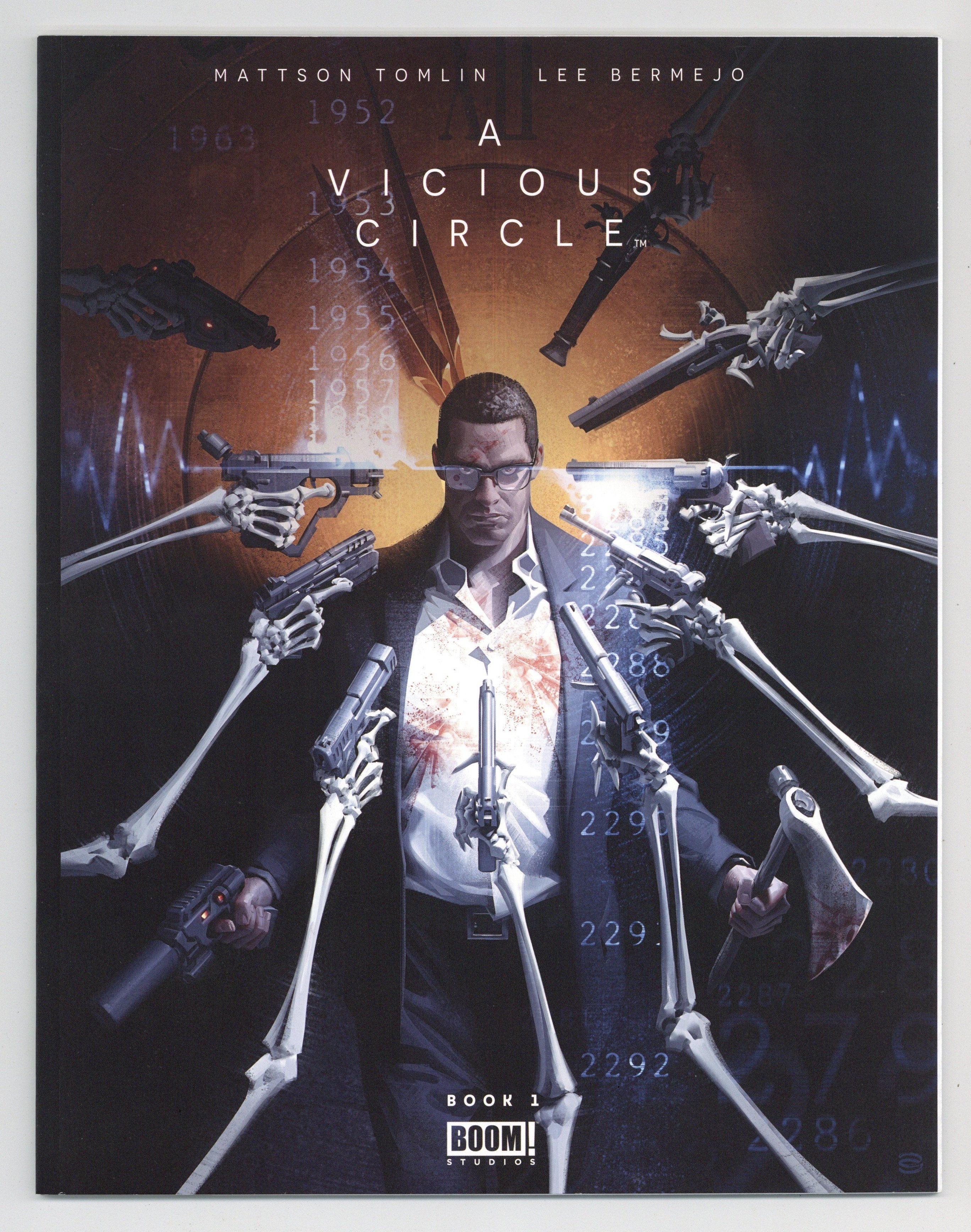 Published Dec 2022 by Boom Studios.$11.00Written by Mattson Tomlin. Art by Lee Bermejo. Cover by Alex Garner. Director, screenwriter, one of the visionaries behind The Batman, and Project Power creator Mattson Tomlin teams up with iconic artist Lee Bermejo (Batman: Damned, Joker)! Shawn Thacker is a trained assassin from the future who seeks revenge on the only other man with his affliction-each life they take forces them both to travel between vastly different past and future eras. Spanning from 22nd century Tokyo to 1950s New Orleans to the Cretaceous Era and beyond, the two mortal rivals are locked in a battle of wills that spans millions of years, all to alter the course of history. With each time period, artist Lee Bermejo adjusts his artististic style to pay homage to luminary comics artists and historical master painters, presented in a prestige, oversized format! Cover price $9.99.