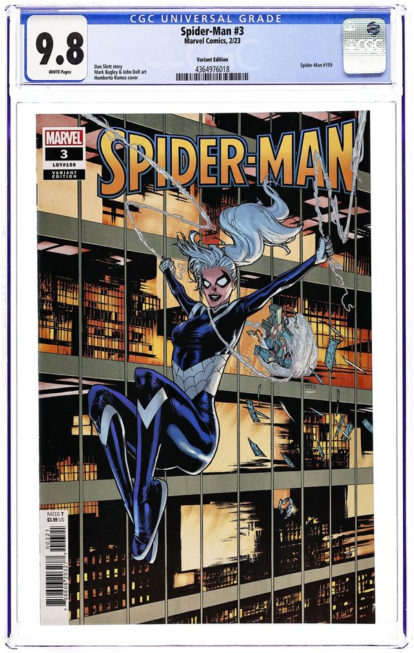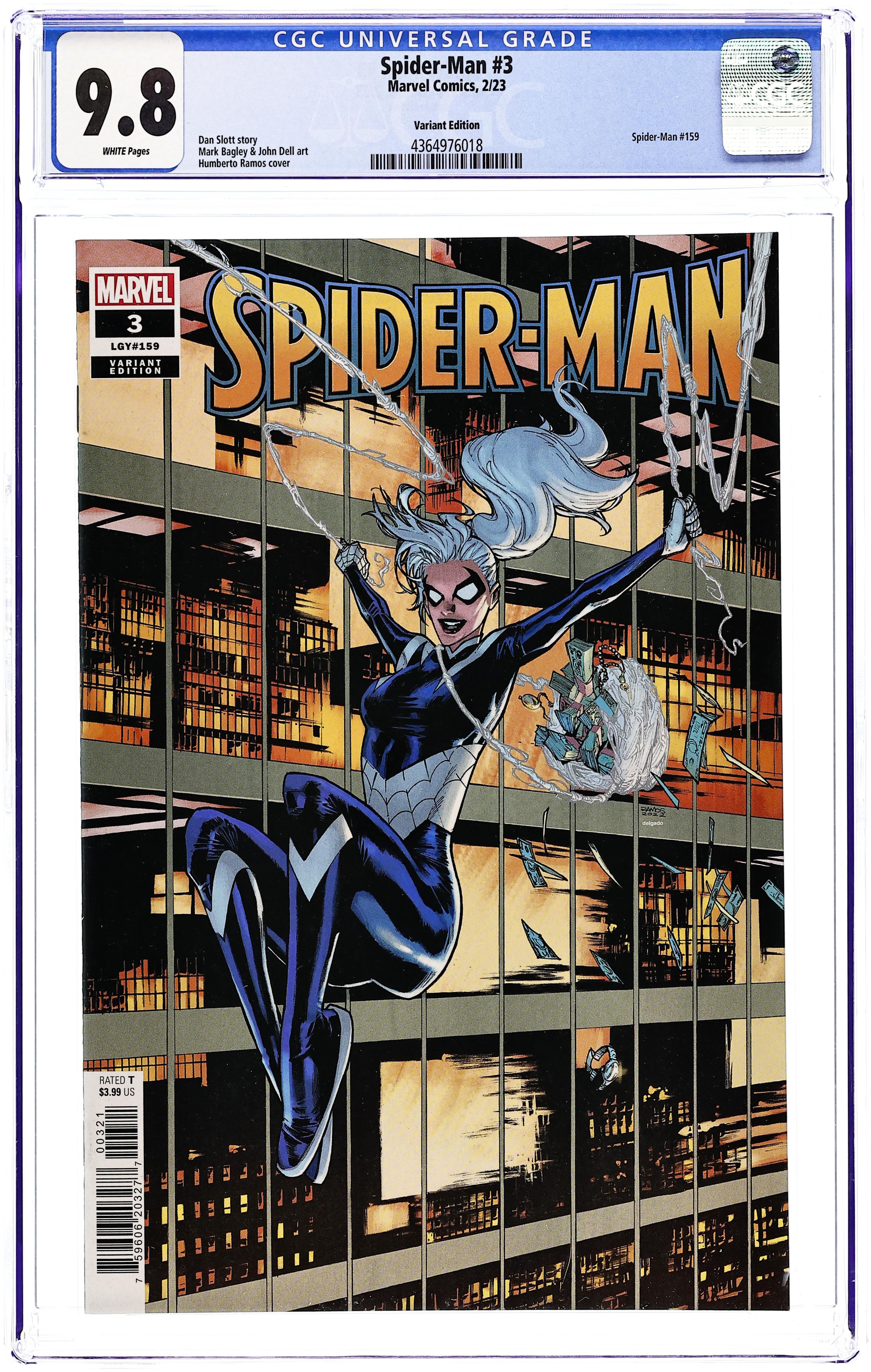 Limited 1 for 25 Retailer Incentive Variant Cover. Written by Dan Slott. Art by Mark Bagley. Cover by Humberto Ramos. "The End of the Spider-Verse" rages on! Spider-Man and Night-Spider have to make an impossible heist against impossible odds! If you thought the first issue was shocking, think again because this issue is going to shake you to your core! Cover price $3.99.