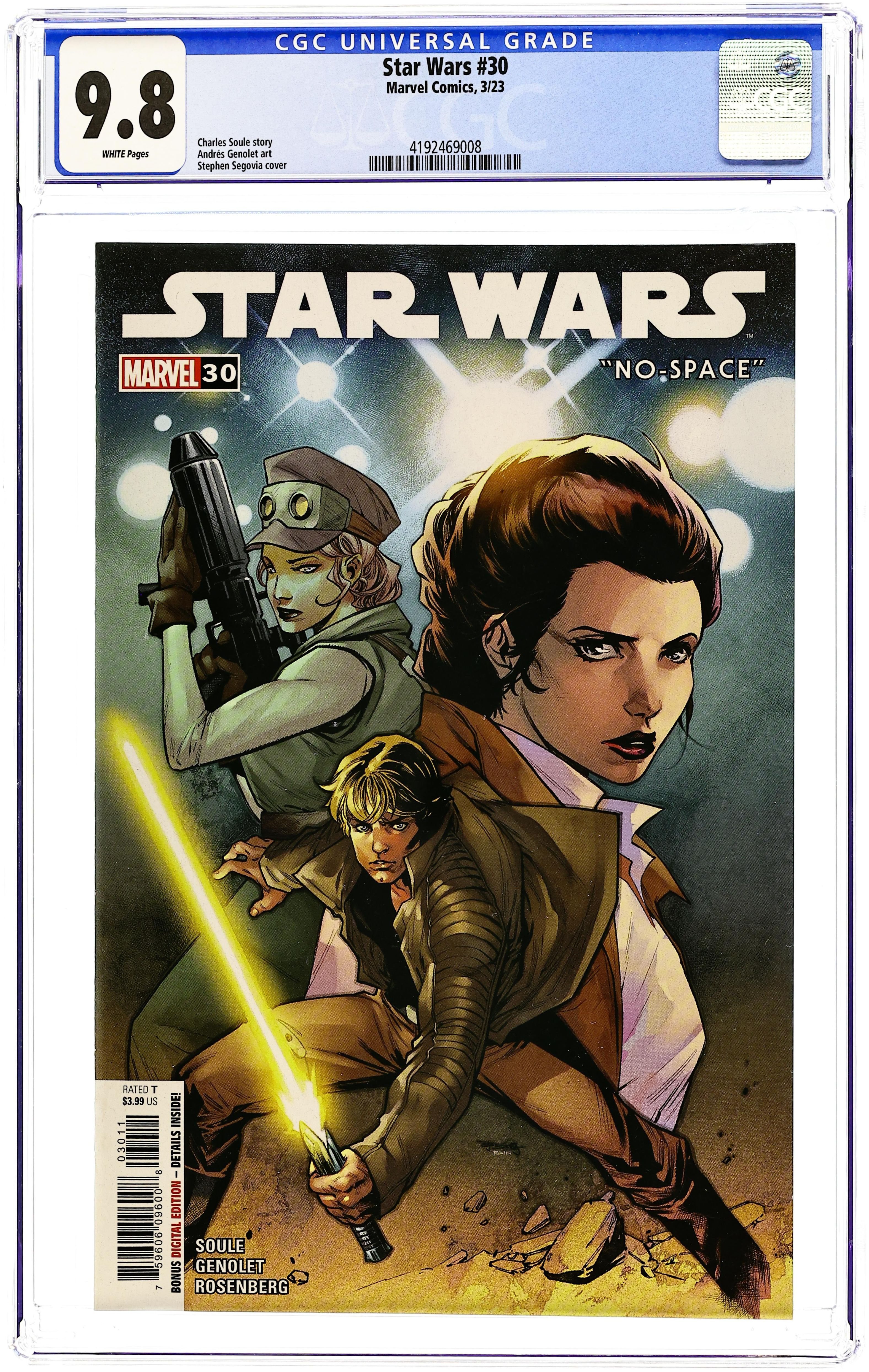 Written by Charles Soule. Art by Andres Genolet. Cover by Stephen Segovia. MAROONED!Some of the Rebel Alliance's best and brightest have gotten lost in an unknown region of space while hunting for a lost treasure. How will LUKE SKYWALKER, LEIA ORGANA, CHEWBACCA, LANDO CALRISSIAN and AMILYN HOLDO ever survive the horrors...of NO-SPACE? 28 pages, full color. Rated T Cover price $3.99.If you add this item to your want list, we will email you when it becomes available.