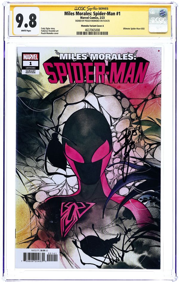 Written by Cody Ziglar. Art by Federico Vicentini. Cover by Peach Momoko. "TRIAL BY SPIDER"! SPIDER-MAN faces the strongest super-powered foes and most dangerous gauntlets the Multiverse can throw his way, and every time MILES MORALES falls, he rises again - stronger than before. Until now. There are some punches you don't get up from and a new villain isn't pulling a single one as they threaten everyone and everything Miles loves. Between school, home, his love life and battling super-charged and upgraded villains night and day - Miles is reaching his breaking point. And when this new foe is finished, Spider-Man's world will be changed forever. Guest-starring MAC GARGAN, A.K.A. THE SCORPION! Don't miss the next Marvel masterpiece from writer Cody Ziglar (AMAZING SPIDER-MAN, SPIDER-PUNK) and artist Federico Vicentini (AMAZING SPIDER-MAN, WOLVERINE)! 40 pages, full color. Rated T Cover price $4.99.