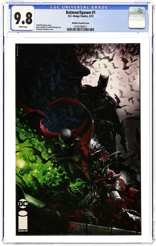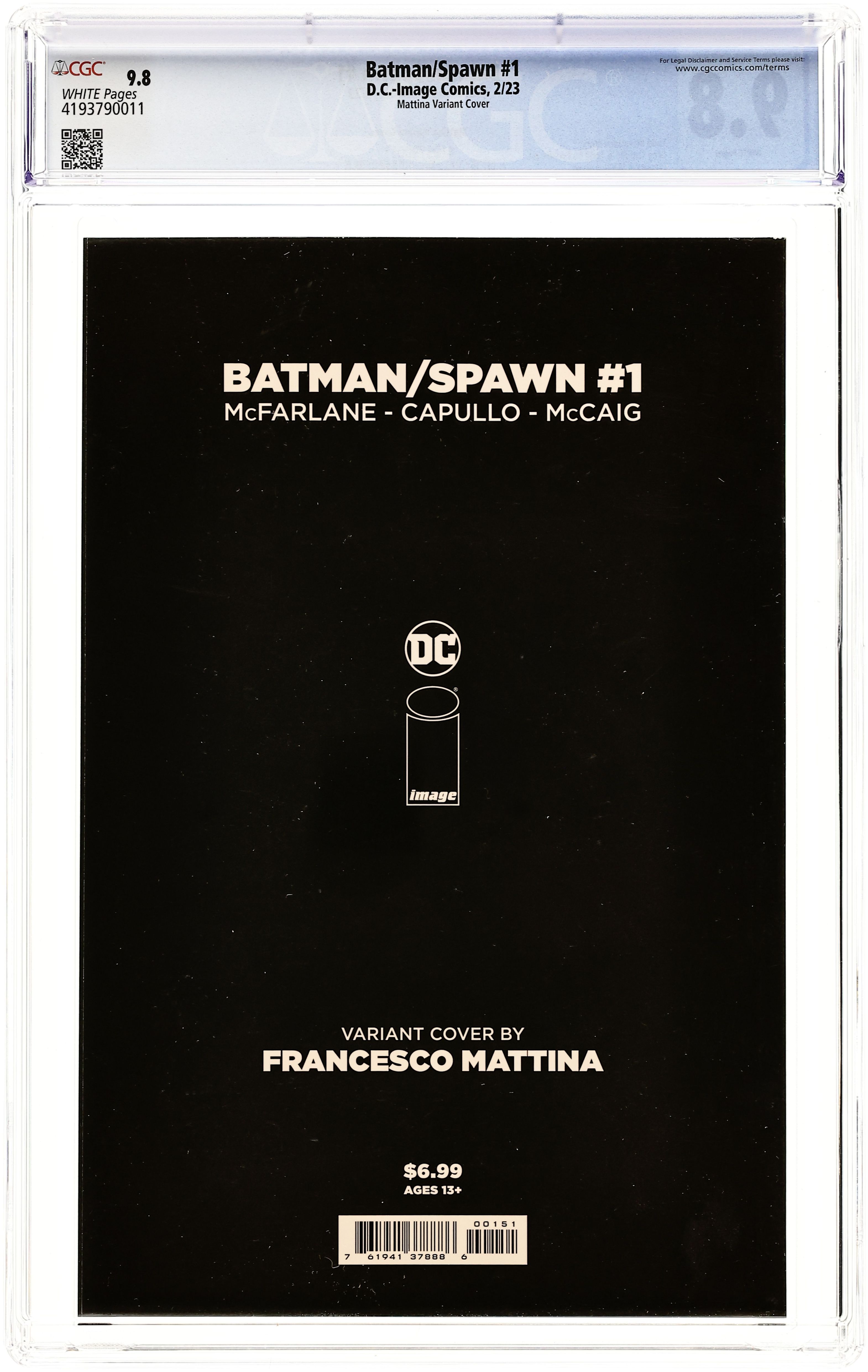 Written by Todd McFarlane. Art by Greg Capullo. Cover by Francesco Mattina. Two dark heroes, cursed by tragedy, find their paths again crossing...but not by choice! What sinister foe is at work, pitting the Dark Knight against the Hellspawn? From the shadows of Gotham City to New York City, this epic event is the blockbuster you've been waiting almost two decades for! 48 pages, full color. Rated Teen Cover price $6.99.