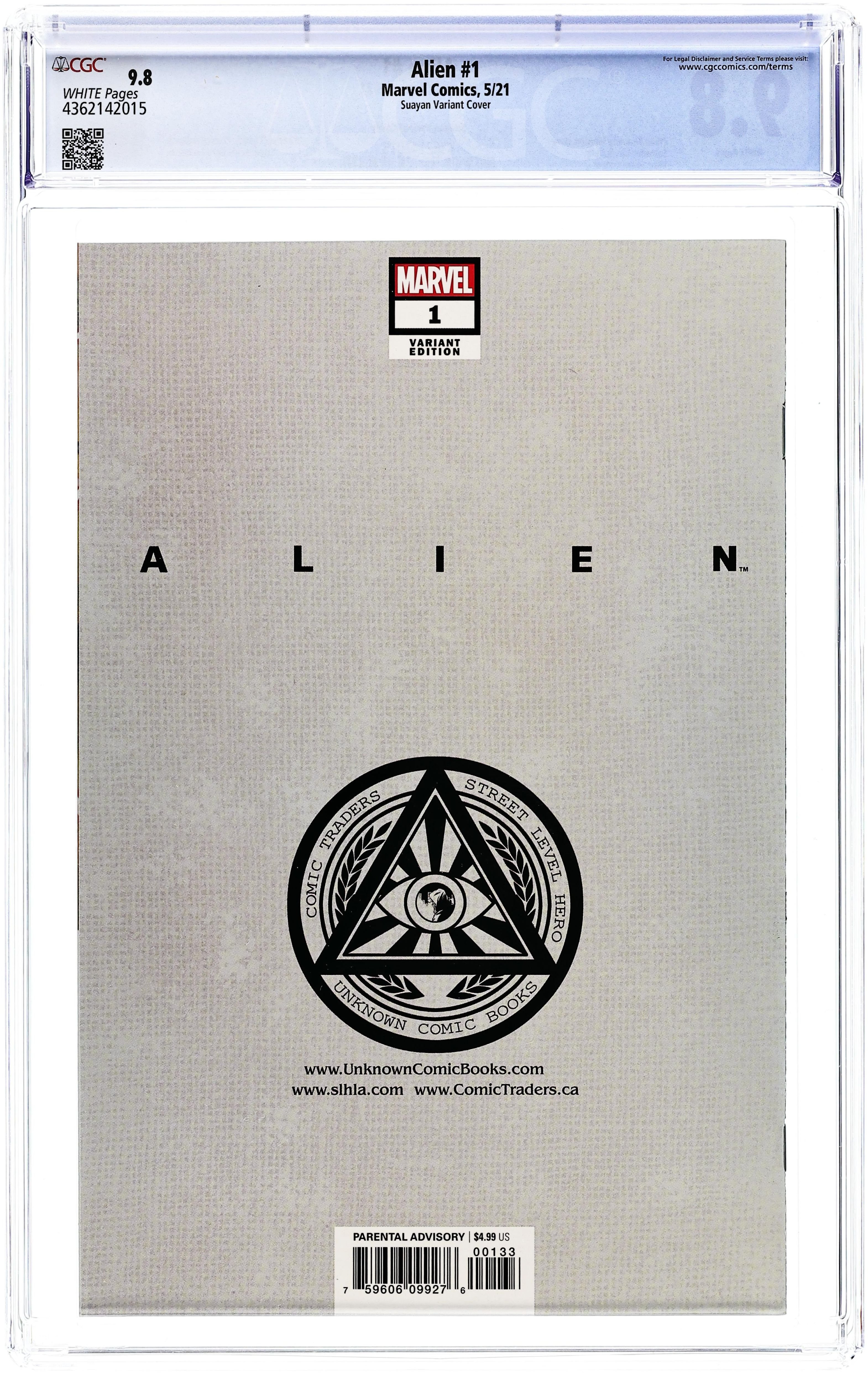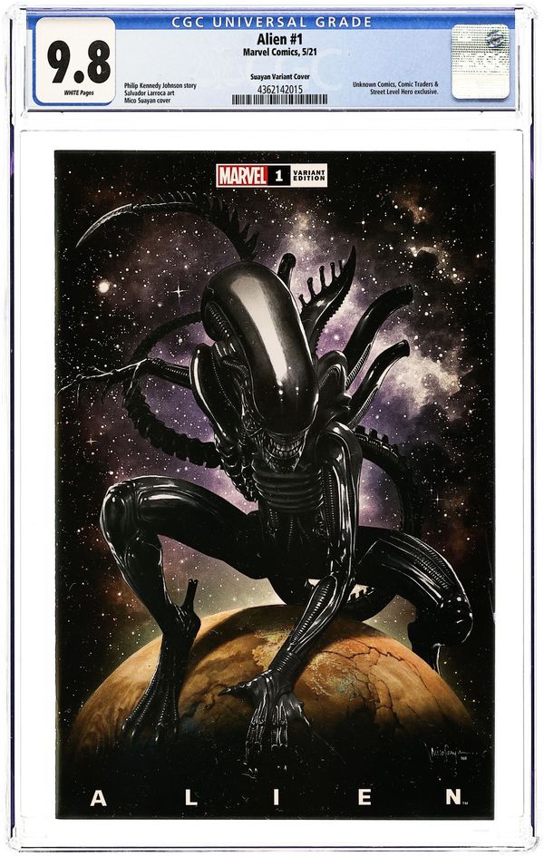 Comics Illuminati (Unknown Comics, Street Level Hero, and Comic Traders) exclusive cover by Mico Suayan. Written by Phillip Kennedy Johnson. Art by Salvador Larroca. THE ICONIC CINEMATIC TERROR MAKES ITS MARVEL DEBUT! Gabriel Cruz gave his life to Weyland-Yutani--In the case of an alien attack he barely survived, almost literally! Recently retired, Cruz is trying to patch things up with his abandoned son with the help of his friend, a Bishop-model android, but his re-entry into civilian life is not going smoothly…and his encounters with the deadly Xenomorph are far from over. Phillip Kennedy Johnson and Salvador Larroca team up to tell an all-new tale of the titan of horror and science fiction that has scared audiences for decades. No one is safe. No one is innocent. And no one can hear you scream. 40 pages, full color. Parental Advisory