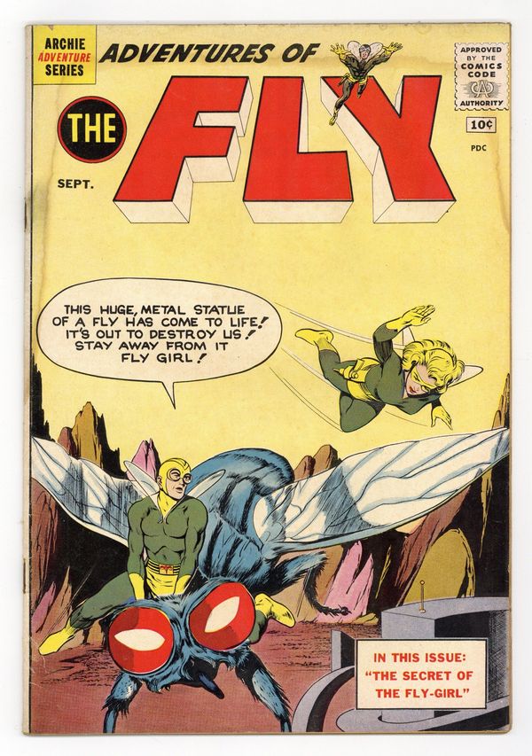 Edited by Victor Gorelick. Cover by John Rosenberger. Stories by Robert Bernstein and John Rosenberger. Archie Comics amiable and agile super-hero The Fly battles an assortment of nefarious villains, including the Metal Monster. Origin & 1st Appearance of Fly Girl In Costume. Ad for the Jaguar comic book.36 pages, full color. $0.10. Cover price $0.10.