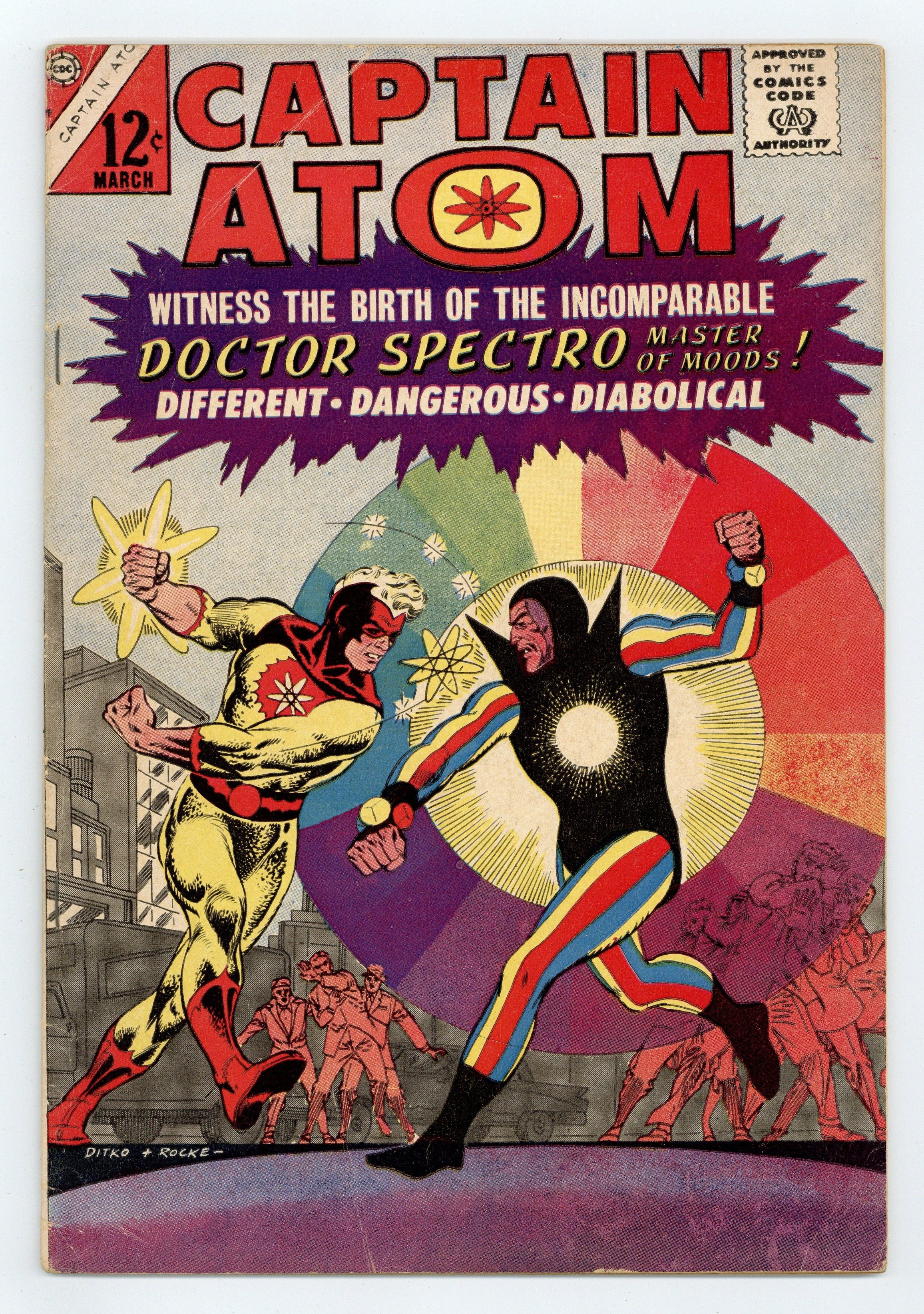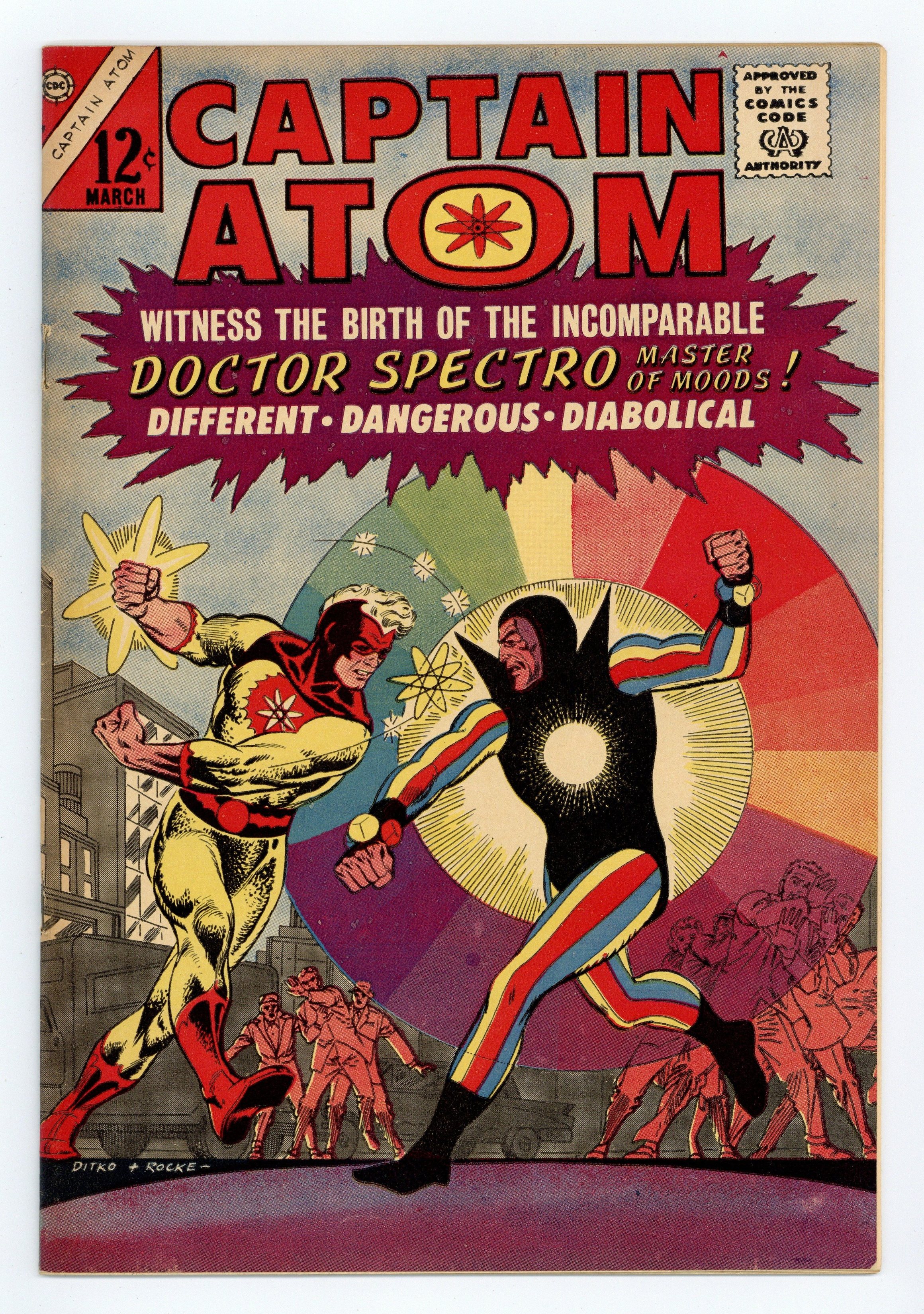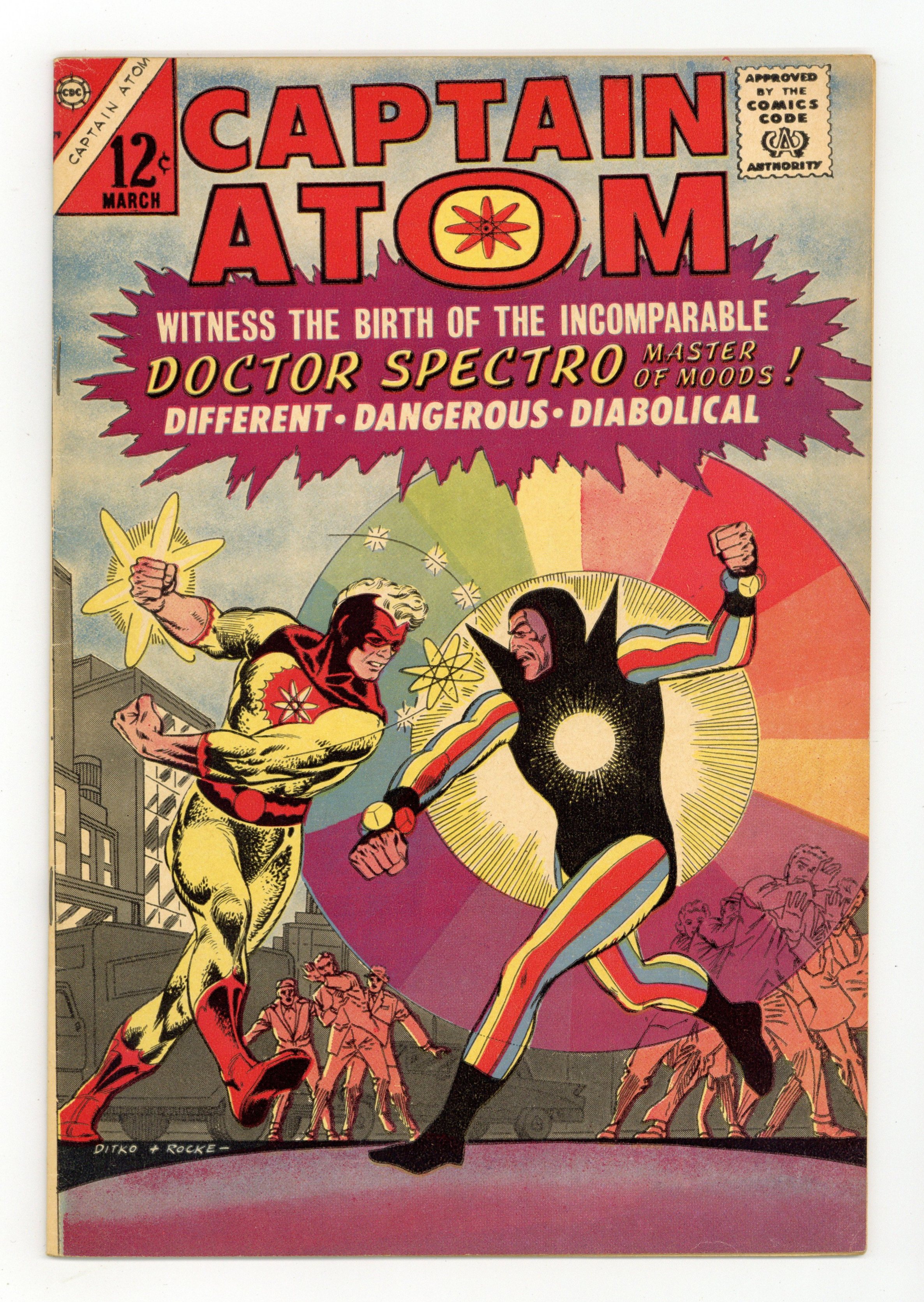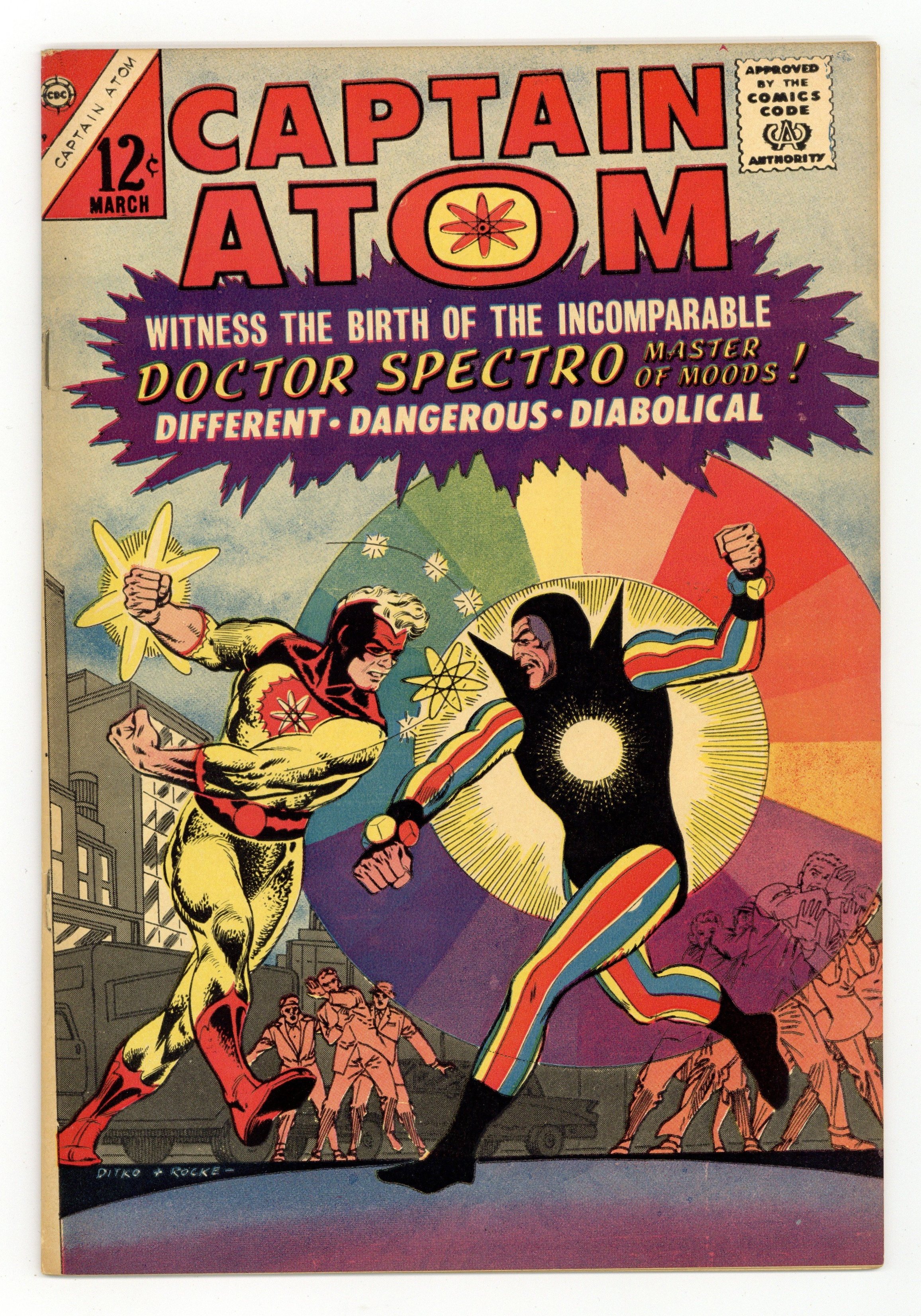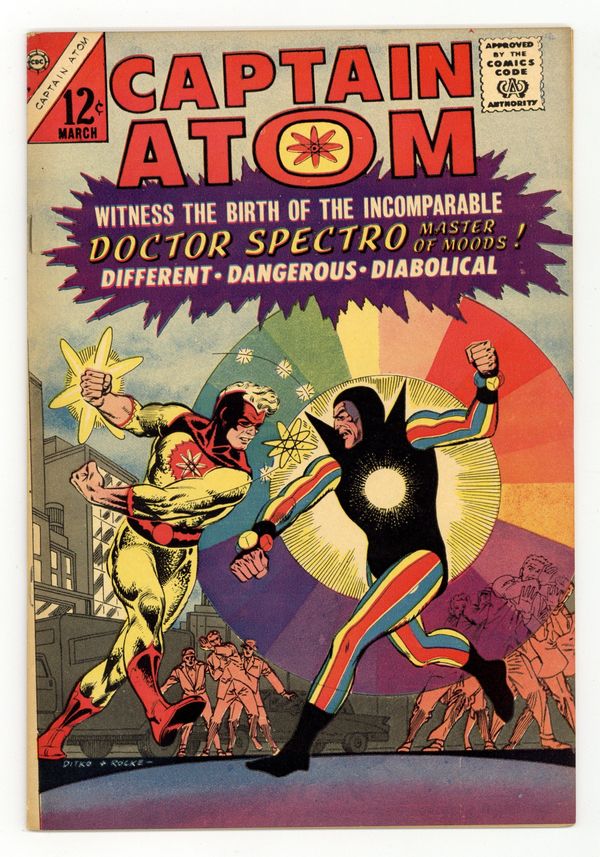 Cover pencils by Steve Ditko, inks by Rocke "Rocke" Mastroserio. Captain Atom Faces Doctor Spectro, script by Steve Ditko (plot) and Joe Gill (script), pencils by Steve Ditko, inks by Rocco "Rocke" Mastroserio; When an Air Force truck is hijacked Captain Atom begins to track down the criminals; Along the way he meets Doctor Spectro, who uses colors and light as weapons. Moon-Run!, art by Steve Ditko. 36 pgs. $0.12. Cover price $0.12.