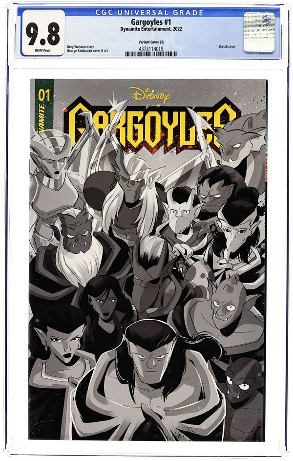 Limited 1 for 10 Retailer Incentive Variant Cover. Written by Greg Weisman. Cover and Art by George Kambadais. All-new ongoing series, in continuity with the epic GARGOYLES television classic! One thousand years ago, superstition and the sword ruled. It was a time of darkness. It was a world of fear. It was THE AGE OF GARGOYLES. Stone by day, Warriors by night, they were betrayed by the humans they had sworn to protect…frozen in stone by a magic spell for a thousand years. Now, here in Manhattan, the spell is broken, and they live again! They are Defenders of the Night! THEY ARE GARGOYLES! Series creator GREG WEISMAN and illustrator GEORGE KAMBADAIS reintroduce the Manhattan Clan, a family of Gargoyles at full strength, though modern New York City is full of attractions and distractions, and each member of the clan has begun to go their own way. But their bonds will be tested, when nefarious factions from all across the world attempt to steal that rarest, most precious of possessions…an unhatched Gargoyle egg! 32 pages, full color. Rated T Cover price $3.99.