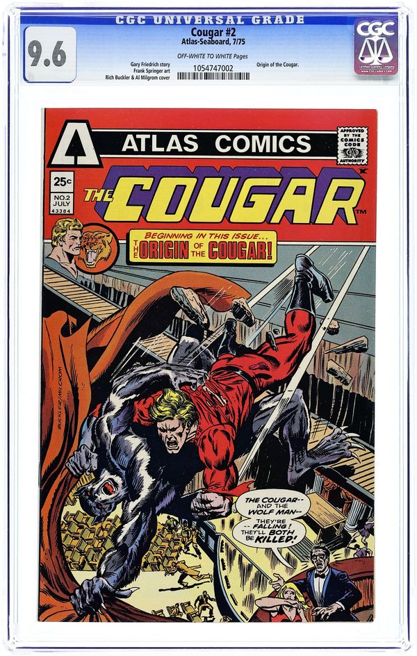 Stuntman/superhero Jeff Rand, a.k.a. The Cougar, confronts the werewolf who killed his family. Part of the short-lived Atlas superhero line from former Marvel publisher Martin Goodman. Final issue of the series. Written by Gary Friedrich, with art by Frank Springer. 32 pages. Cover by Rich Buckler and Al Milgrom. Cover price $0.25. Cover price $0.25.