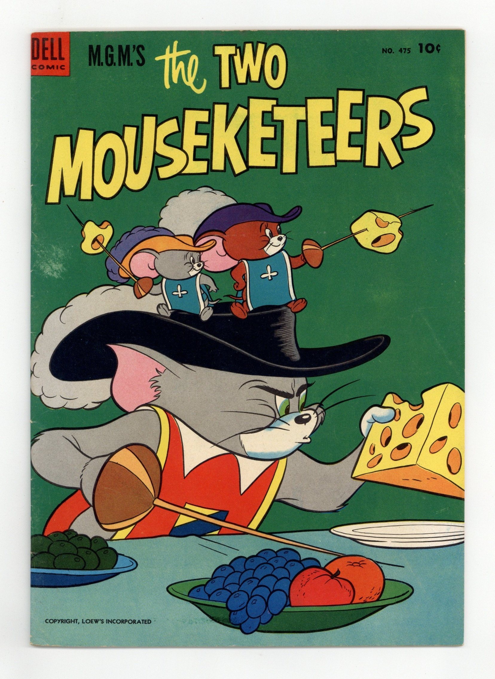 Indicia title is "M.G.M.'s THE TWO MOUSEKETEERS, No. 475." Cover art by Harvey Eisenberg. The Mouseketeers Come to the King's Castle, art by Harvey Eisenberg; The Two Mouseketeers come to the castle of a greedy King; They outwit the castle's cat (called "Poosycat" in this story), put the King in the dungeon, and invite the townspeople to a banquet. Milky Way, art by Lee Hooper; he Three Little Kittens are punished for losing their mittens by having to go to bed with no supper; In their room they come up with a plan to use some balloons and a basket to escape out their window. Nibbles Comes to Town, art by Lynn Karp; A farm mouse named Nibbles comes to town and settles in a house that has a parrot and a dim-witted dog. 36 pages, full color. Cover price $0.10.