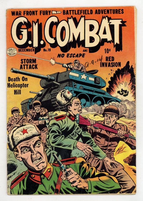 $57.00Cover by Dick Dillin and Chuck Cuidera. Written by unknown. Art by Charles Nicholas, Louis Ravielli? and unknown. War front fury! Battlefield adventures! In this issue: "Red Invasion," with pencils by Charles Nicholas; "No Escape"; "Storm Attack," with art by Louis Ravielli?; 1-page text story "The Plane from Nowhere," reprinted from Blackhawk (1944 1st Series) #30; and "Death on Helicopter Hill"! 36 Pages, Full Color. Cover price $0.10.