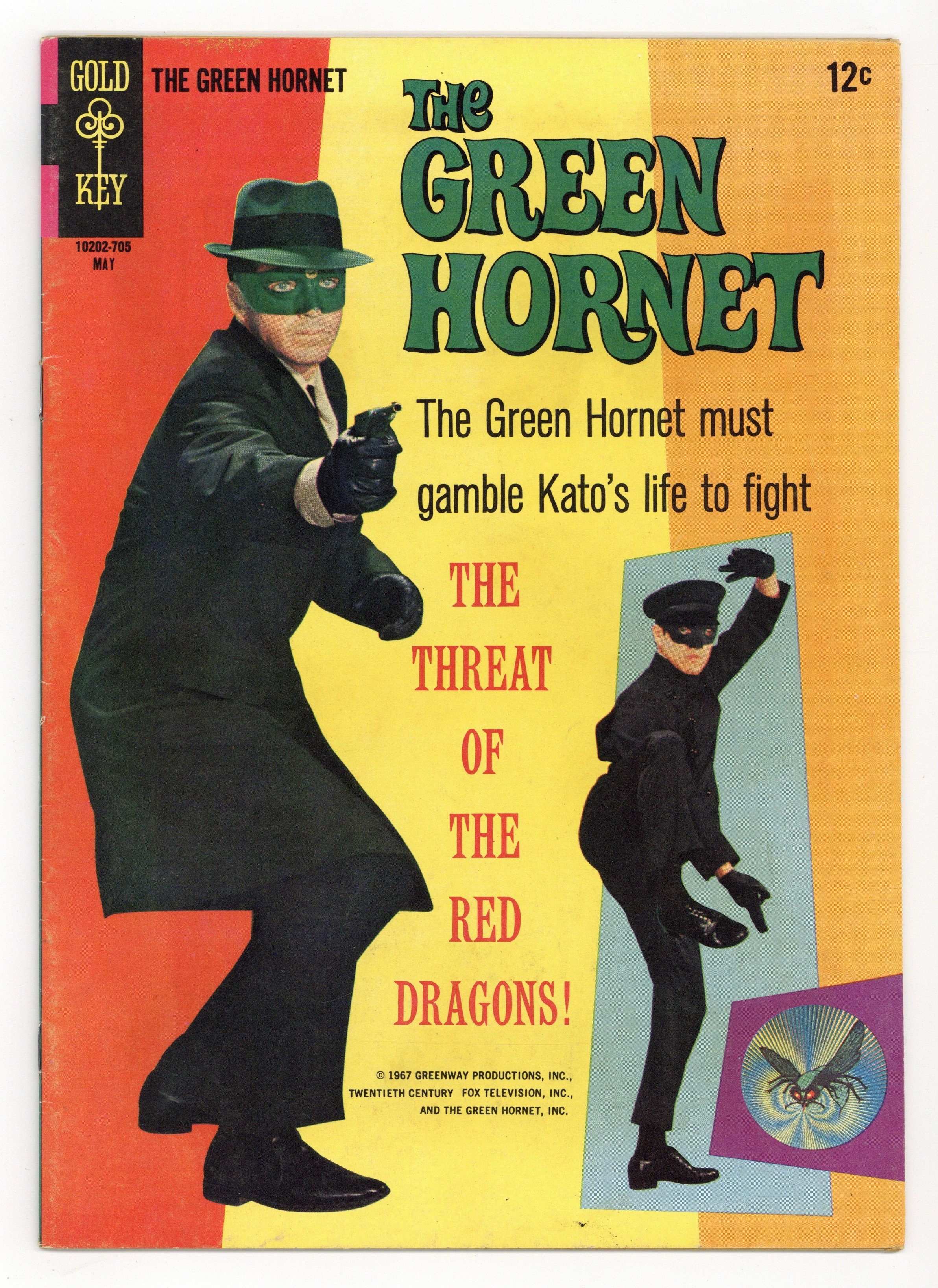 Number on cover: 10202-705 May. Photo cover of Van Williams as the Green Hornet and Bruce Lee as Kato. Three photos of Van Williams as the Green Hornet, two of which also have Bruce Lee as Kato, and a textual introduction to the issue's main story. The Threat of the Red Dragons, script by Paul Newman, art by Dan Spiegle; In "Chinatown" a gang of toughs is extorting money from people by threatening relatives still residing in Communist China, and the Green Hornet finds that identifying their leader is easier said than done. A discussion of the bonefish, with five illustrations. Photo of Bruce Lee as Kato ("houseboy" uniform) & Van Williams as Britt Reid, and another of Wende Wagner as Casey Case. Photo of Bruce Lee as Kato ("houseboy" uniform) & Van Williams as Britt Reid, and another of Wende Wagner as Casey Case. Based on the classic TV series. 36 pgs. $0.12. Cover price $0.12.