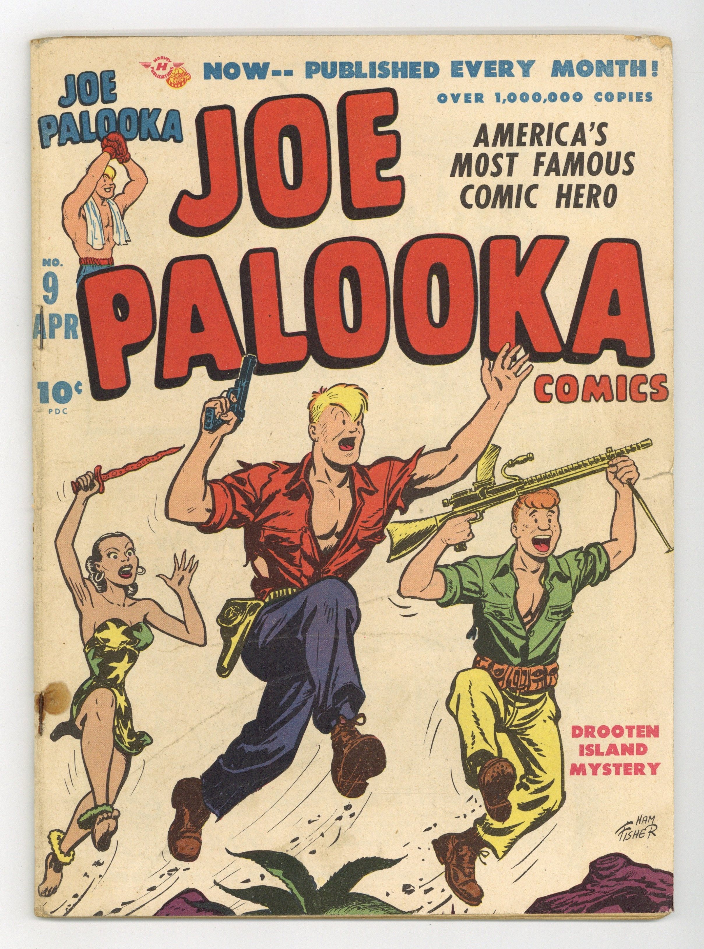 Cover by Ham Fisher (credited). Stories and art by Ham Fisher, Bob Powell, Jack Keeler, Salo, Joe Simon and Jack Kirby. Ham Fisher's comic-strip boxer has adventures both inside and outside the ring. In the South Pacific, Joe and Jerry ride the derelict Japanese ship to Drooten Island, seemingly safe from the Axis on a Dutch plantation, but Polynesian refugee Melody suspects a trap. Chickie Ricks, The Flyin' Fool, wrestles with Umblau, the mad genius with the fate of the world in a vial in his hands, in a story with nice good-girl art and a terrific splash page by Bob Powell. Plus a prose adventure of the superhero Stuntman, with spot illustration by comics legends Joe Simon and Jack Kirby. Also featuring a "letter to the reader" from publisher Alfred Harvey about Harvey's latest strip-to-comic-book acquisition, Terry and the Pirates. The Drooten Island Mystery; Drootens Hospitality; Jungle Rendezvous; Amazing Discovery; Stuntman: Ferryboat Menace; Junior Genius: The Great Train Mystery!; The Flyin Fool: Umblau the Genius; Cartoon Laughs. 52 pages, Full Color. Cover price $0.10.