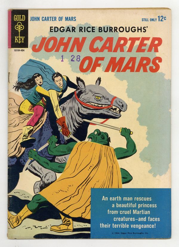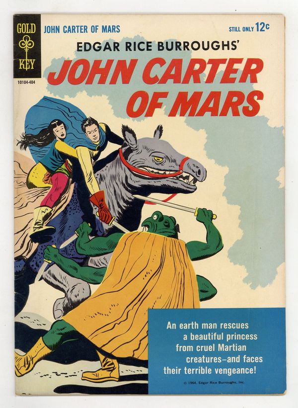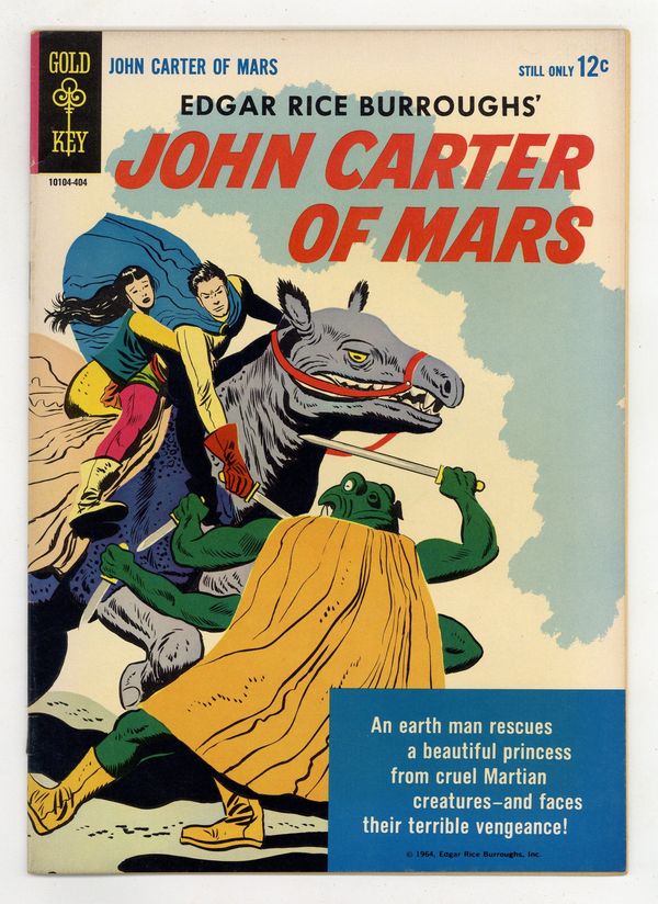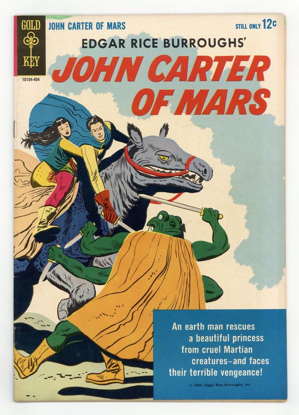 $29.50Reprints Four Color 375. The Prisoner of the Tharks. Somewhat faithful adaptation of E.R. Burroughs "The Princess of Mars," updating Carter to a vet of the Korean War instead of the Civil War. Written by Gaylord Du Bois, with art by Jesse Marsh. Story originally appeared in 1952. Cover by Marsh. 36 pages. Cover price $0.12.