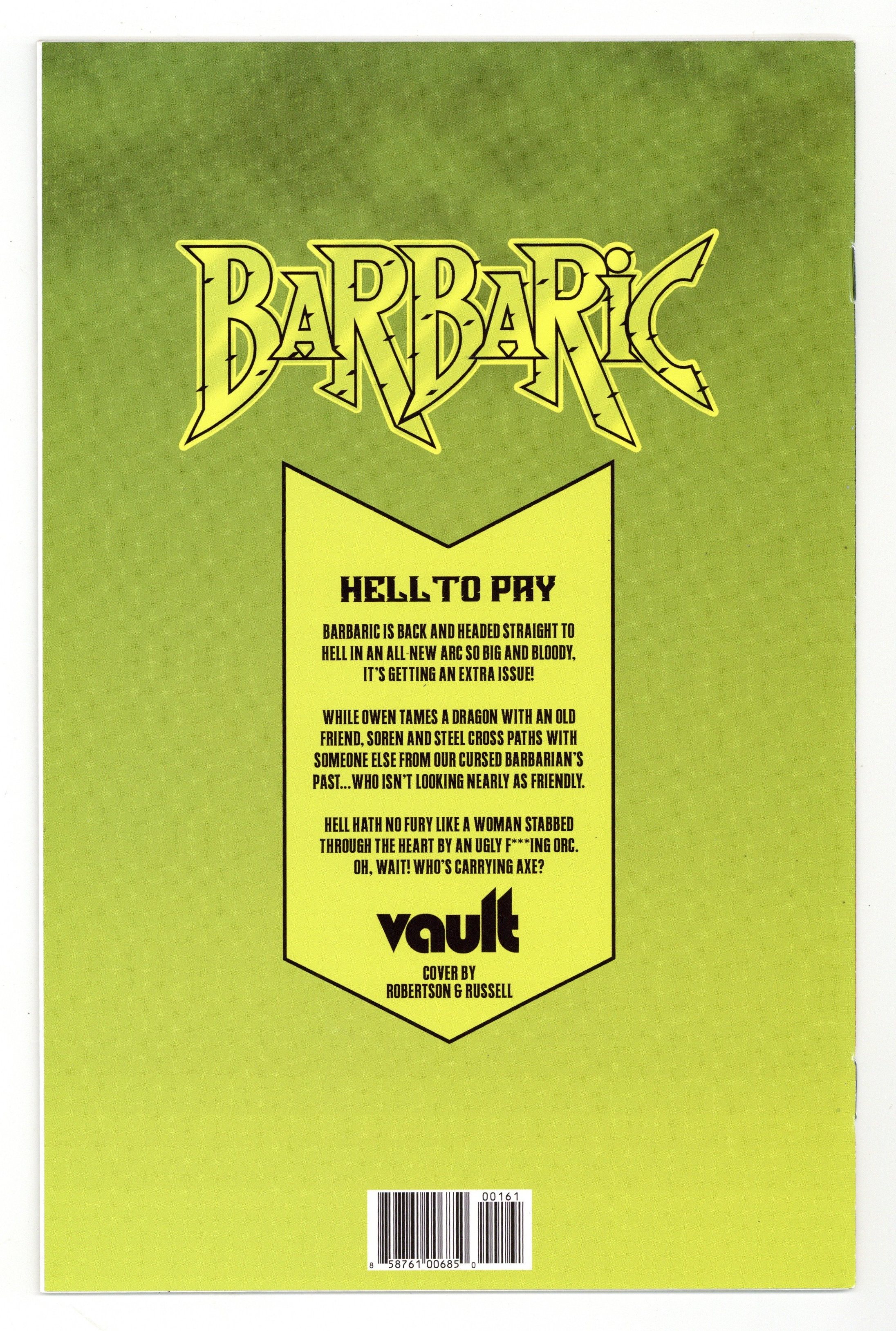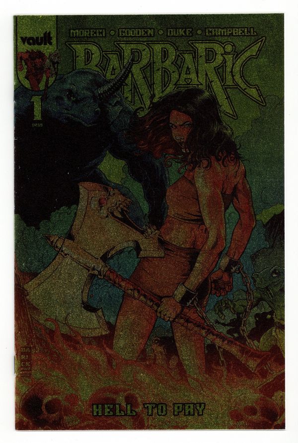 Published 2023 by Vault Comics.$60.00Limited 1 for 100 Retailer Incentive Variant Cover. Written by Michael Moreci. Art by Nathan Gooden. Cover by TBA. Barbaric is back and headed straight to hell in an all-new arc so big and bloody, it's getting an extra issue! While Owen tames a dragon with an old friend, Soren and Steel cross paths with someone else from our cursed barbarian's past…who isn't looking nearly as friendly. Hell hath no fury like a woman stabbed through the heart by an ugly f***ing orc. Oh, wait! Who's carrying Axe? 24 pages, full color. Cover price $4.99.