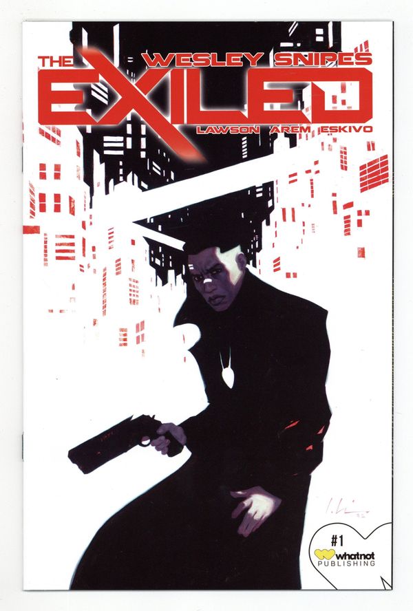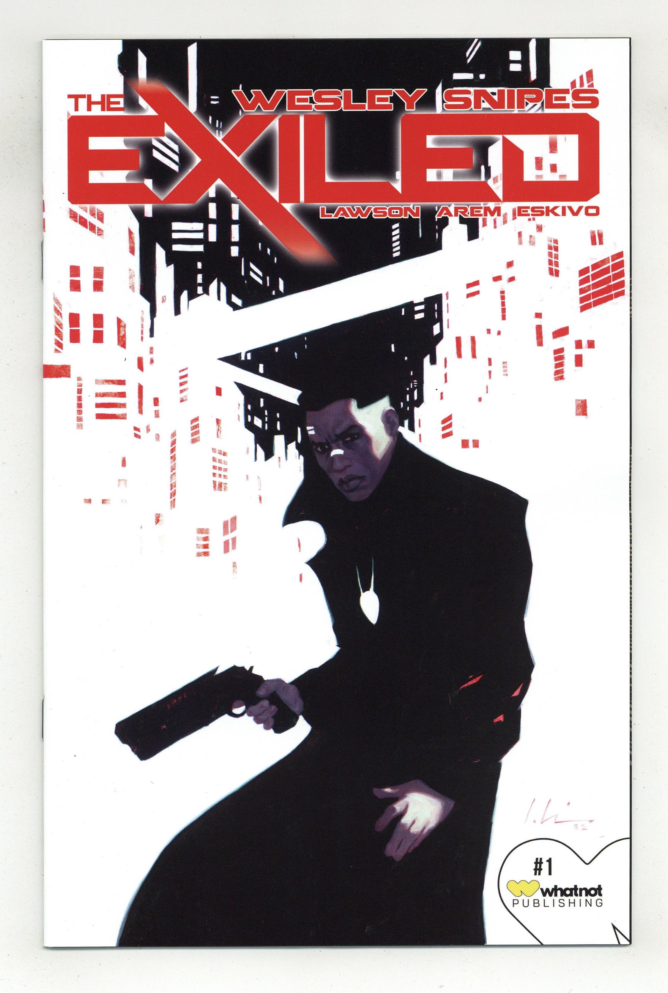 Published Feb 2023 by Whatnot Publishing.$2.65Limited 1 for 50 Retailer Incentive Variant Cover. Written by Wesley Snipes & Various. Art by Eskivo. Cover by Jeremy Wilson. Whatnot Publishing Co-Founder Michael Calero (Alpha Betas, Quested) homages an iconic Blade image. WESLEY SNIPES (producer and star of the Blade franchise) presents his original series, THE EXILED, a genre-bending Sci-Fi Noir described as 'Seven meets Blade Runner.' The Exiled follows hardboiled detective Niles 'Roach' Washington as he pursues a serial killer who is using mysterious, ancient tools to rip the spines from his victims. When forces outside and within the police department attempt to discredit him for his theories, Roach's instincts keep pushing him forward. With enemies on all sides, Roach wades deeper into the conspiracy and uncovers a secret 5000 years in the making. 32 pages, full color. Cover price $3.99.