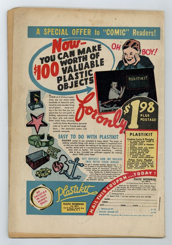 Stories and art by Sid Greene, George Markos, Herman C. Browner, Robert Sanders and Howard Larsen. Non-fiction comics about advances in science at mid-century. This was the first comic under the Charlton imprint. A speculative article about the future of aviation, including discussions of the first jet engines then in development. Some predictions came true, like intercontinental passenger flights, but others involving dirigibles, flying wings, and the family four-seater plane did not. Auto designer Preston Tucker and the Tucker Tornado. Plus a cutaway diagram of an observatory's space telescope. Aviation of Tomorrow; Scientific Wonders; Inventors Paradise; Your Own Aquarium; Bringing the Sun Inside; The Miracle Drug; Marvels of Science; Coaxial Cable Miracle; Odd Inventions; Electric Servants; Spiders!; The Torpedo Auto; Buna-S; Link Trainer Adaptations. 48 pages, Full Color. Cover price $0.10.