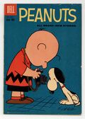 Cover by Charles Schulz. Stories and art by Anthony Pocrnich, Dale Hale and John Stanley. The three Peanuts issues of Four Color (1942-1962 Dell 2nd Series) count as the first three issues, in Dell's reckoning. A short-lived series translating Charles Schulz' beloved strip to comic books; Schulz only did the covers, farming out the interior stories to friends and co-workers. After Schroeder tosses an unwanted ring in her direction, Lucy starts telling everyone that she and Schroeder are engaged. Snoopy takes emergency measures to keep infant Sally out of trouble. Charlie Brown and Linus manage to catch a large fish, but when they find out what "cleaning" the fish really means, they throw it back. Plus a Sluggo story (as in Nancy and Sluggo) written by Little Lulu legend John Stanley. The Blowout; The Engagement Ring; Exploded Theory; The Junk King; Snoopy: The Haunted Hound; Blanket Washing Day; Sluggo: Crossed Blades; Muddled Menu; Fish Story; The Fabulous Outfielder. 32 pages, Full Color. Cover price $0.10.