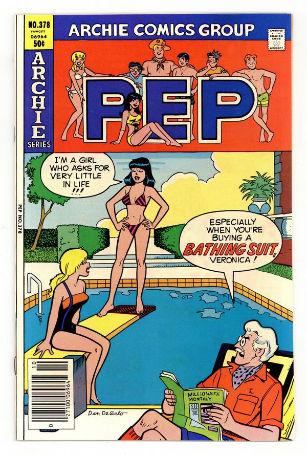 Cover pencils by Dan DeCarlo. Hostess snack cakes ad with Josie. "Fit to Be Tied," script and pencils by Dick Malmgren, inks by Jon D'Agostino; Archie keeps Reggie and Moose awake while they're trying to get some shut-eye. "Tact Act"; Reggie winks at Midge at the beach. Campfire Maze page with Archie. "Part of the Click," script and pencils by Dick Malmgren; Archie schedules a date with both Veronica and Betty at the same time, so Archie tries to ditch Betty to keep his date with Veronica. "Stop the Presses," script and art by Joe Edwards; Jinx decides to start a kid's newspaper. Moose's Riddlers activity page. Archie Club News. "Muscle Beach," script and pencils by Dick Malmgren, inks by Jon D'Agostino; While waiting for Veronica at the beach, Archie gets accused of harassing another woman. 36 pgs., full color. Cover price $0.50.