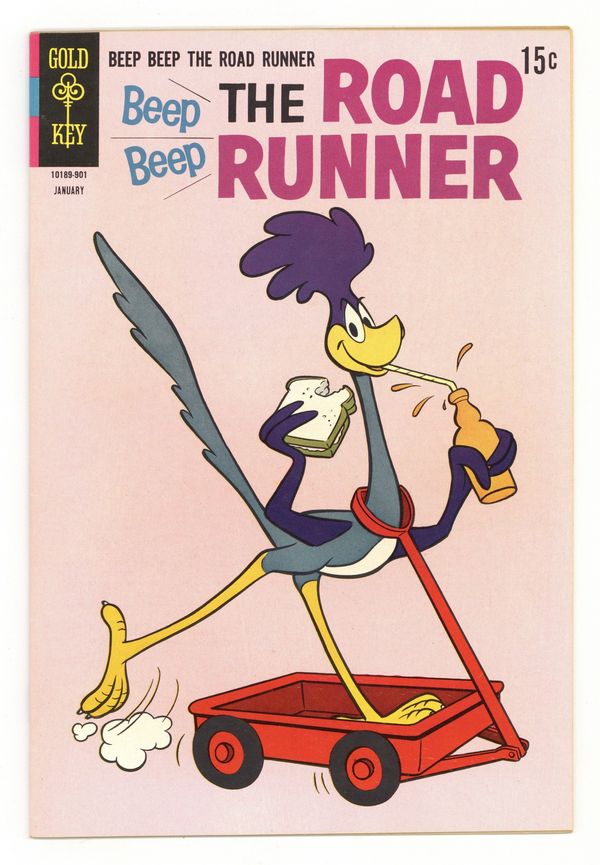 Comic book adventures of the famous Warner Bros. cartoon characters The Road Runner and Wile E. Coyote. The Road Runner in "Mirage Barrage," "Ali Baba Beep," "Air Scare," "A Wily Device," and "Jeep Beep." Issue also has Gold Key Comics Club News features. No story/art credits given. Cover price $0.15.