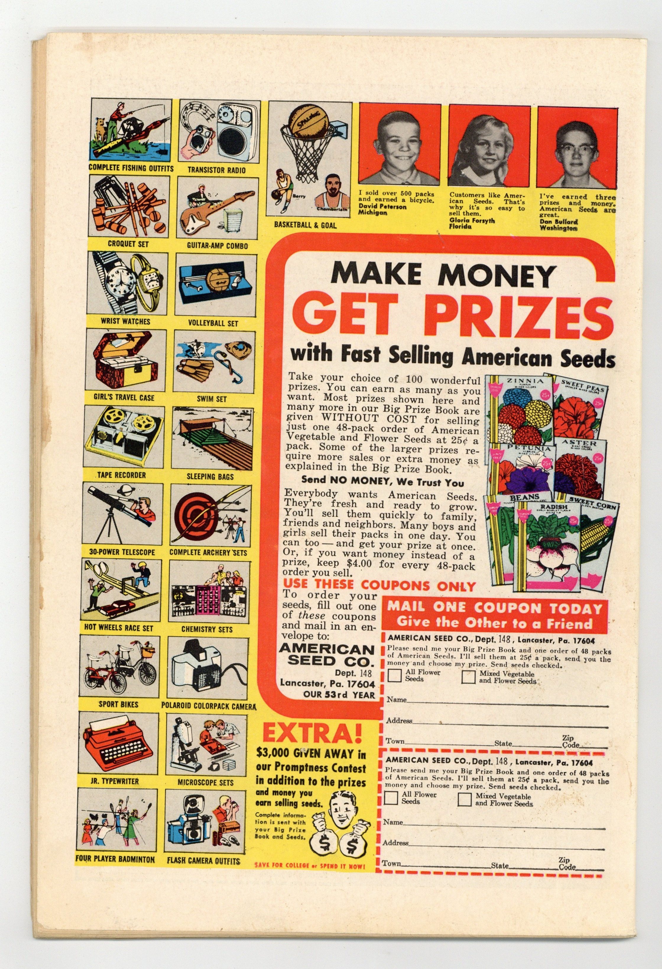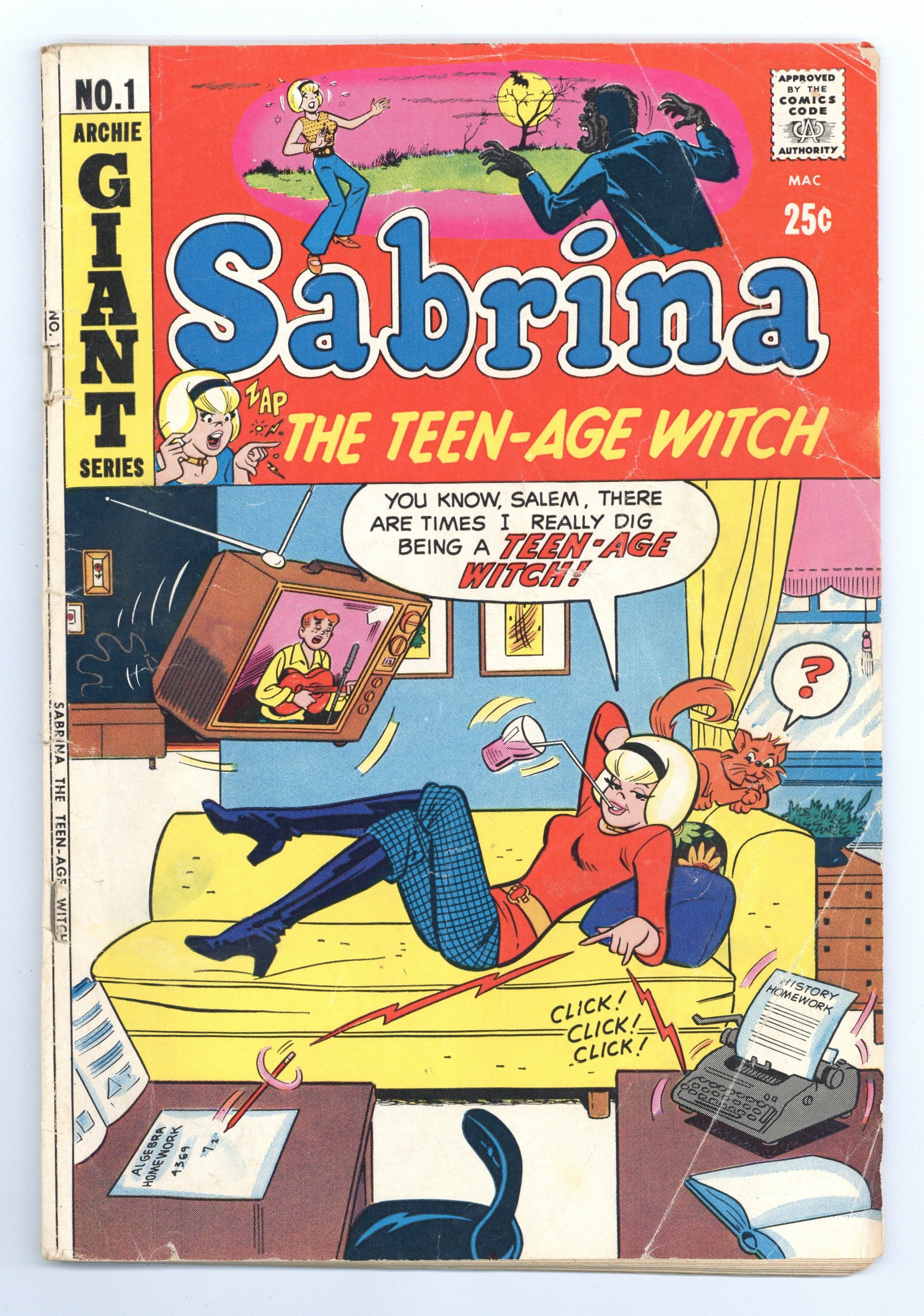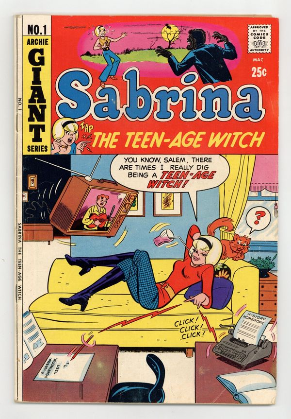 Cover pencils by Dan DeCarlo, inks by Rudy Lapick. Strange Love starring Sabrina, script by Dick Malmgren, pencils by Dan DeCarlo, inks by Rudy Lapick; When Sabrina sees Harvey with another girl, she decides to pay him back by going out with another man, so she puts Archie under her spell and makes him uncontrollably in love with her. Math Path starring Li'l Jinx, script and art by Joe Edwards. The Transylvanian Touch--Archie's Mad House, script by George Gladir, art by Orlando Busino. pen House For Monsters--Archie's Mad House, script by George Gladir, art by Orlando Busino. Sabrina & Salem's Catty Quiz, pencils by Dan DeCarlo, inks by Rudy Lapick. Mission Impossible starring Sabrina, script by Dick Malmgren, pencils by Gus LeMoine, inks by Jon D'Agostino. Sabrina Puzzle page. The Sampler starring Sabrina, pencils by Dan DeCarlo, inks by Rudy Lapick. An Uncle's Monkey starring Sabrina, script by Dick Malmgren, pencils by Dan DeCarlo, inks by Rudy Lapick. 52 pgs. $0.25. Cover price $0.25.