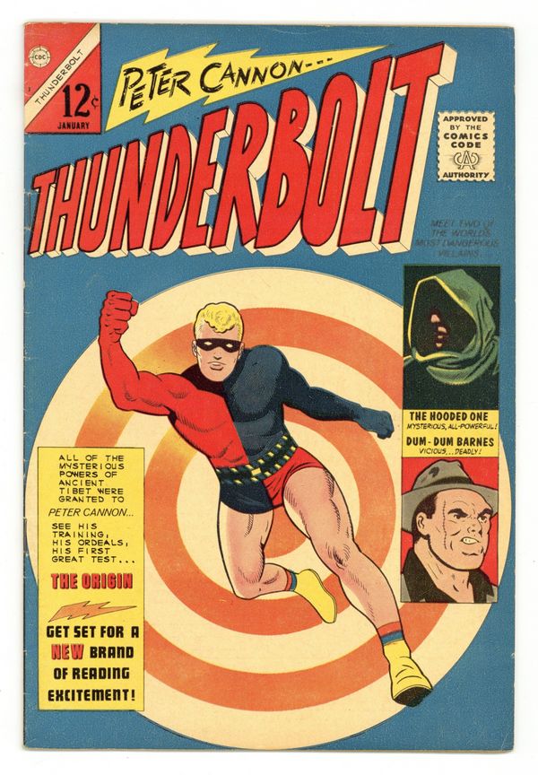 Published Jan 1966 by Charlton Comics Group.$65.00Cover by Pete Morisi. Stories and art by Pete Morisi, Pat Masulli and Ernie Bache. Trained from birth by Tibetan monks to attain physical and mental perfection, Peter Cannon becomes Thunderbolt, one of Charlton's most significant contributions to the superhero genre. When an old enemy named The Hooded One threatens the USA, Cannon reluctantly dons a red and blue costume, becoming Thunderbolt for the first time. The Origin of an Avenger; The Dream Camera; The Mercenaries. 32 pages, Full Color. Cover price $0.12.
