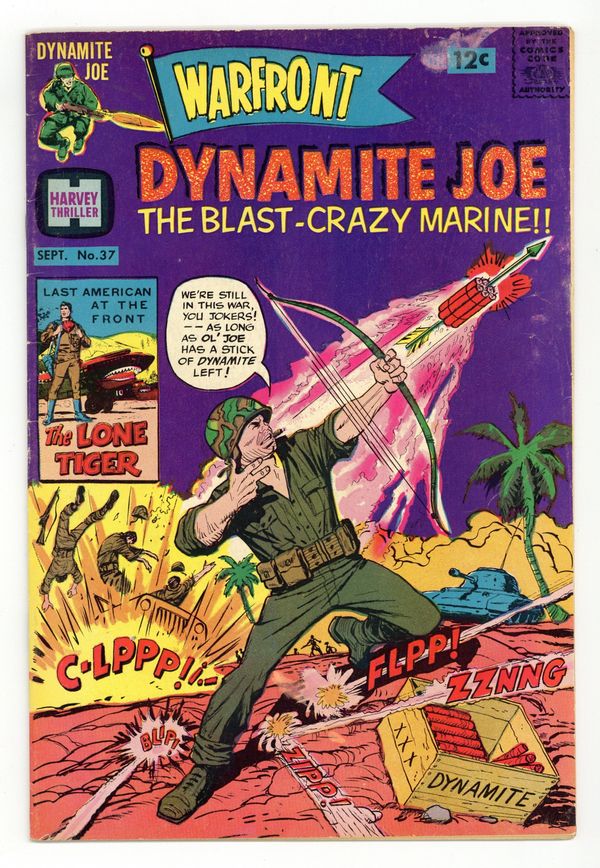Stories and art by Wally Wood, Dan Adkins, and Jack Sparling. Harvey resumes its war title as Vietnam becomes the latest American conflict. Dynamite Joe, "The Blast-Crazy Marine," meets the Die-Hard Patrol. The last American in Japanese-held WWII China is an air ace who becomes known as The Lone Tiger. Soldier-for-hire Dollar Bill Cash finds plenty of fights to choose from. Plus true tales of war in the air. Most of the issue features the art of comics legend Wally Wood. One-Way Street; The V-3; The Lone Tiger; Tiger Shark; Flying Mercenary; Cashing In. 36 pages, full color. Cover price $0.12.