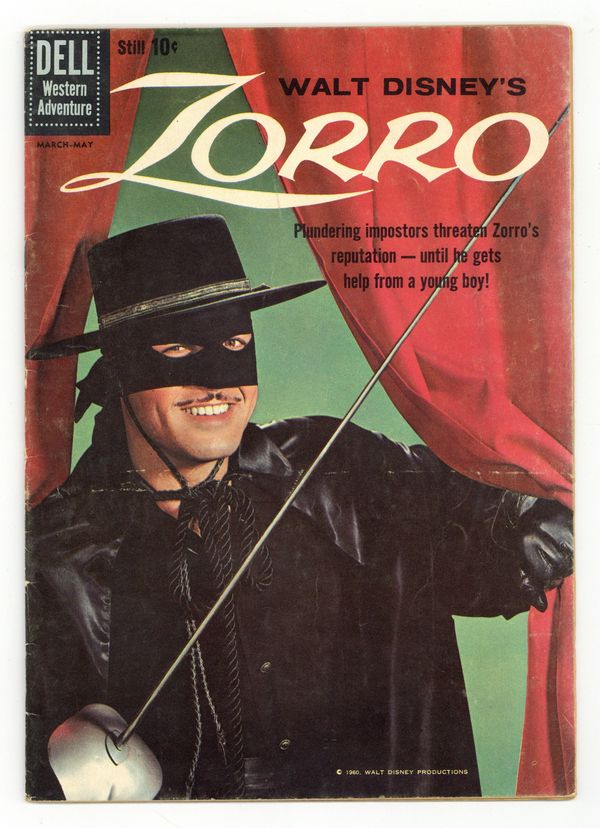 $17.50Art by Warren Tufts and Alex Toth. Photo cover features Guy Williams, star of Disney's Zorro TV series. Dell presents adventures of Johnston McCulley's masked avenger of Old California, based on the hit Walt Disney TV series. Stagecoach robbers disguise themselves as Zorro to frame the hero for their crimes. An old man uses trained burros to oppose a bandit gang, in a story with art by the legendary Alex Toth. The Masqueraders of Los Gatos Canyon; The Bandidos; Sailor's Brand; The Welcomed Intruder; Smog Is Not New; Land Granted; Brave Garcia. 36 pages, B&W. Cover price $0.10.