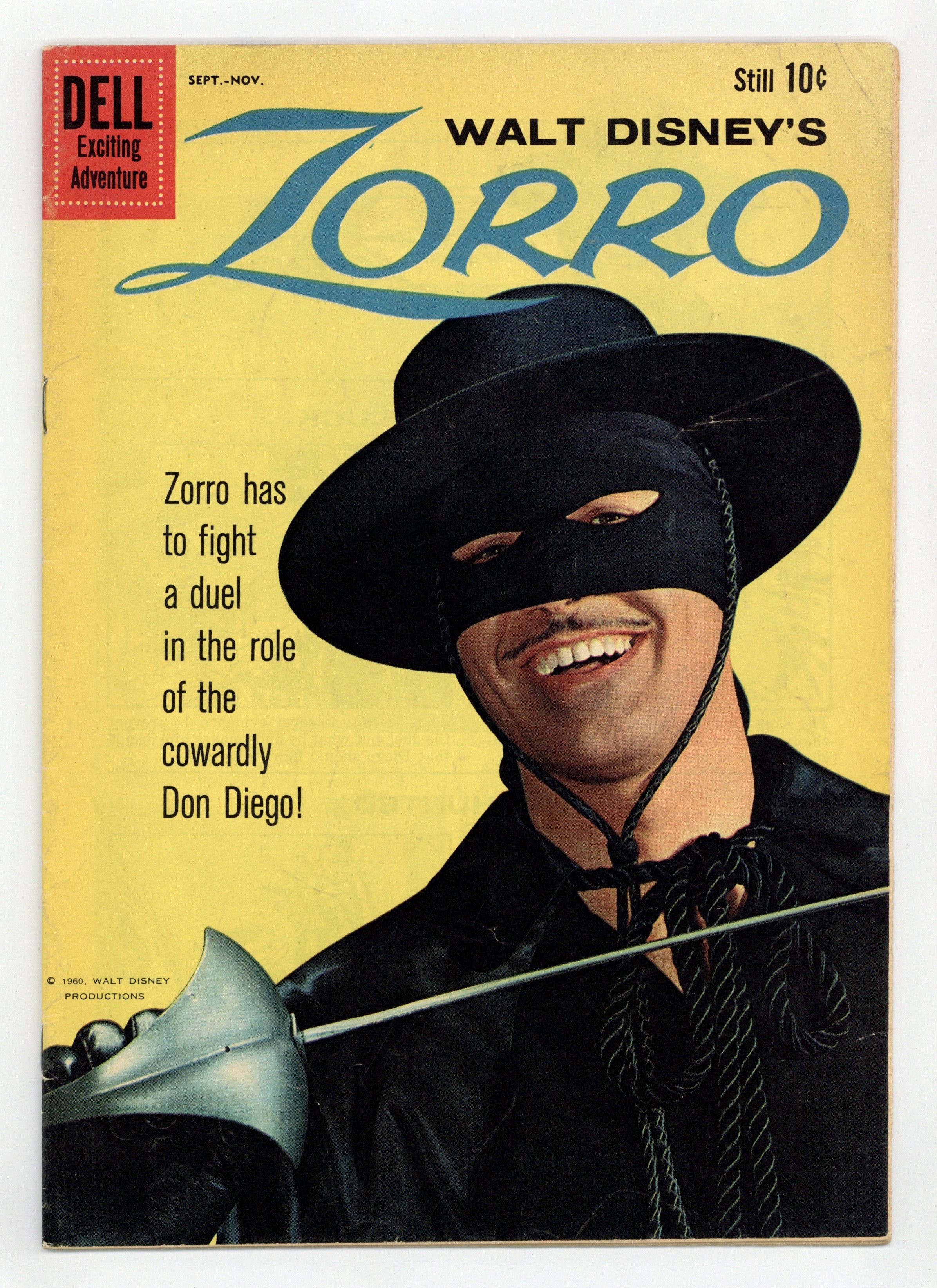 $37.00Art by Mel Keefer and Sparky Moore. Photo cover features Guy Williams, star of Disney's Zorro TV series. Dell presents adventures of Johnston McCulley's masked avenger of Old California, based on the hit Walt Disney TV series. Zorro must fight a duel in his civilian identity as the cowardly Don Diego; the bounty hunter Senior Rolfo offers to capture Zorro dead or alive. A Stroke of Luck; The King's Emissary; Lazy Luis Takes a Walk; The Hunted; Too Many Zorros; The Mustangs; The Jest. 36 pages, B&W. Cover price $0.10.