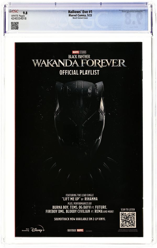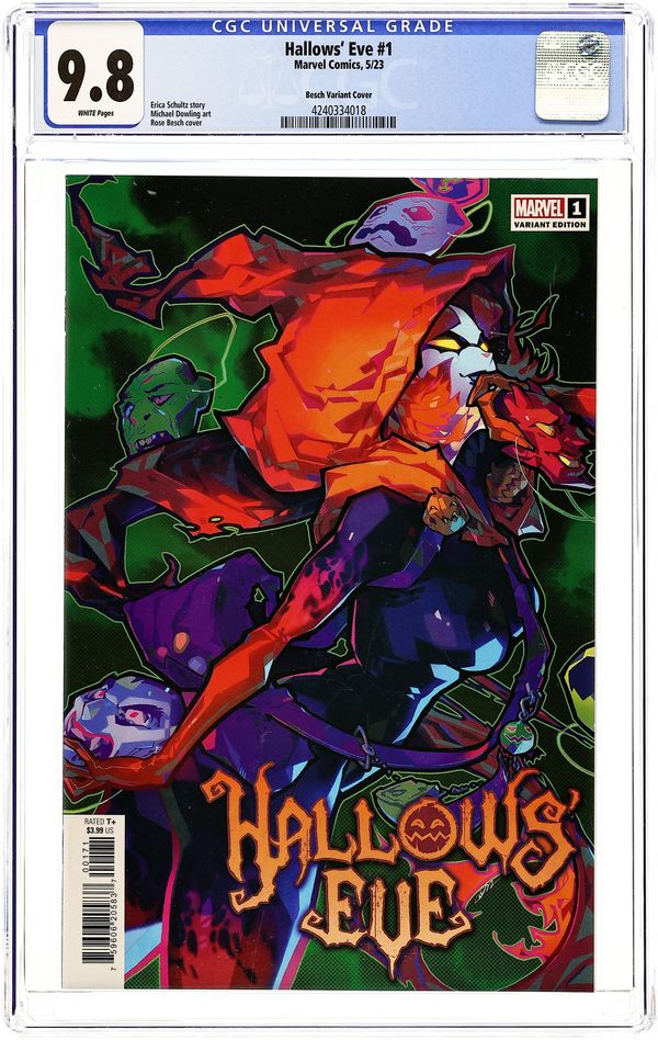 Written by Erica Schultz. Art by Michael Dowling. Cover by Rose Besch. Spinning out of AMAZING SPIDER-MAN, Hallows' Eve gets her own series! Janine Godby's world has been blown up several times in her life, but this time. she has a bag of super-powered masks and a chip on her shoulder. She's on the run from the police, but there's someone else after her too. Don't miss this breakout character break even bigger! 32 pages, full color. Rated T+ Cover price $3.99.