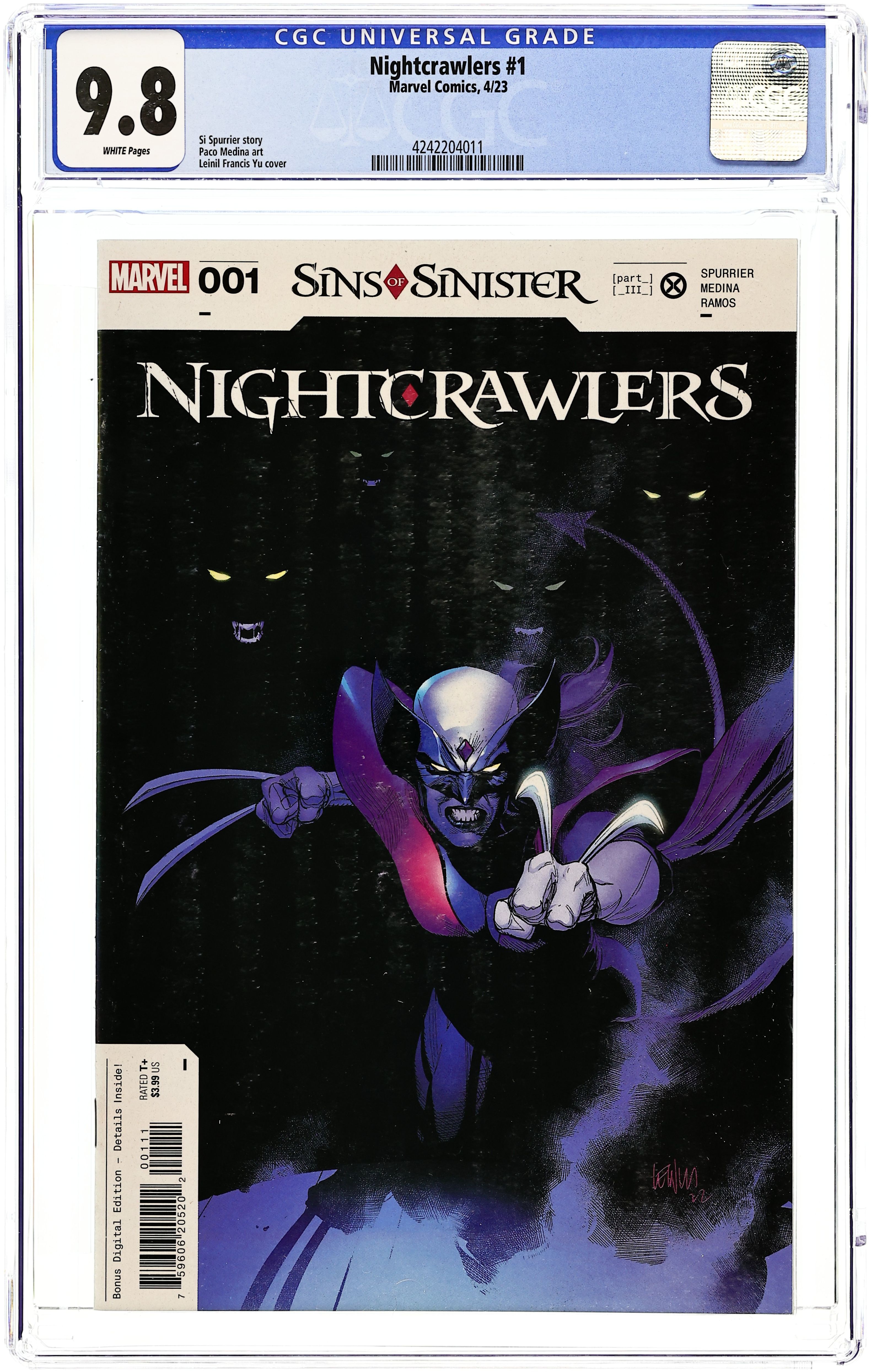 Written by Si Spurrier. Art by Paco Medina. Cover by Leinil Yu. Ten years into a twisted future, MR SINISTER unleashes his private army of assassins: THE LEGION OF THE NIGHT. Meet WAGNERINE, commanding this killer crew of brainwashed hybrids, each one a genetic mix of NIGHTCRAWLER and another one of Marvel's most murderous mutants! Mysterious forces seek to break Sinister's control over these fatal fanatics - to turn them AGAINST HIM. But who are they? And what are their true motives...? Enter MOTHER RIGHTEOUS... and a meeting of the most powerful players in the Universe... 28 pages, full color. Rated T+ Cover price $3.99.
