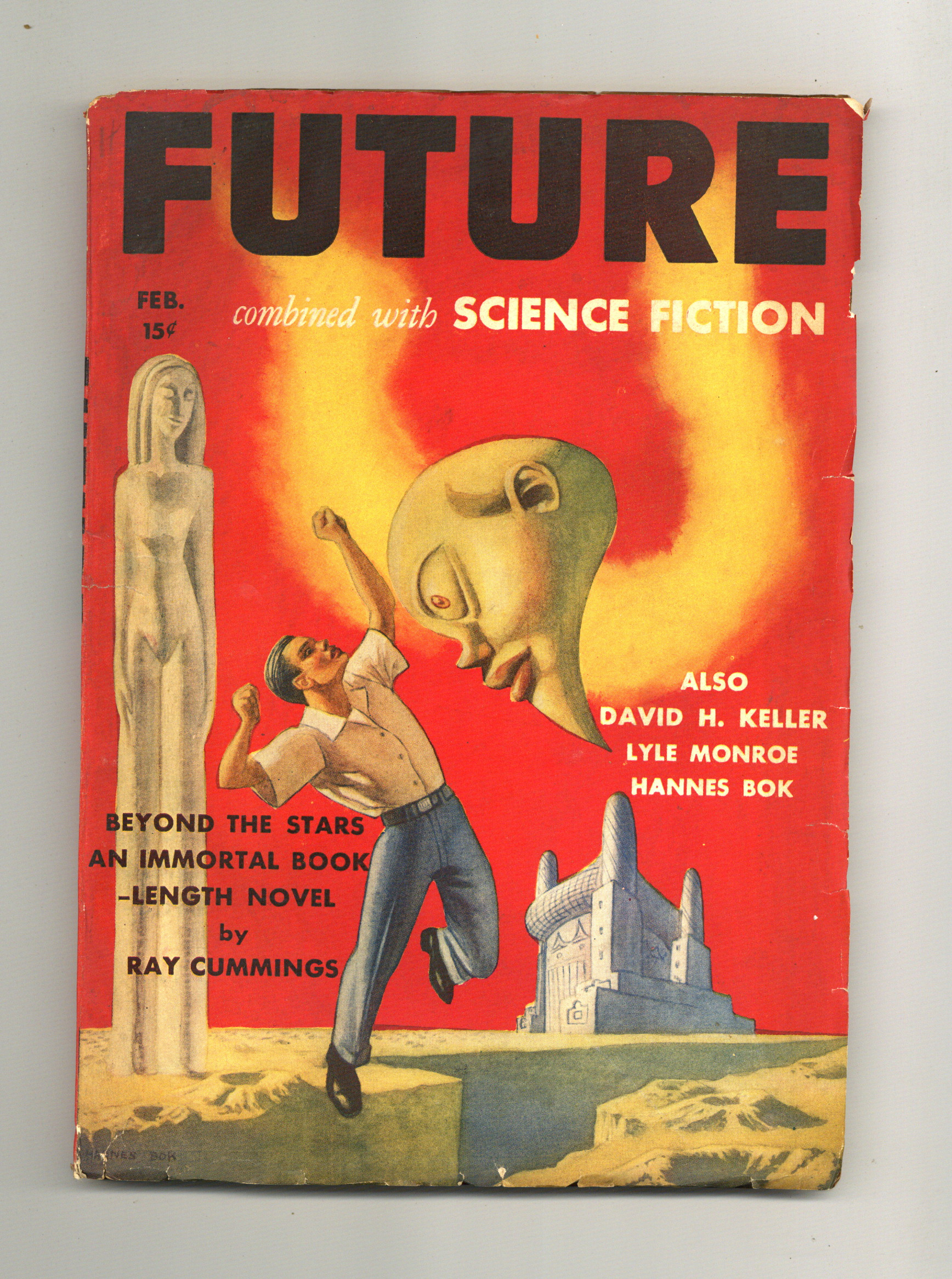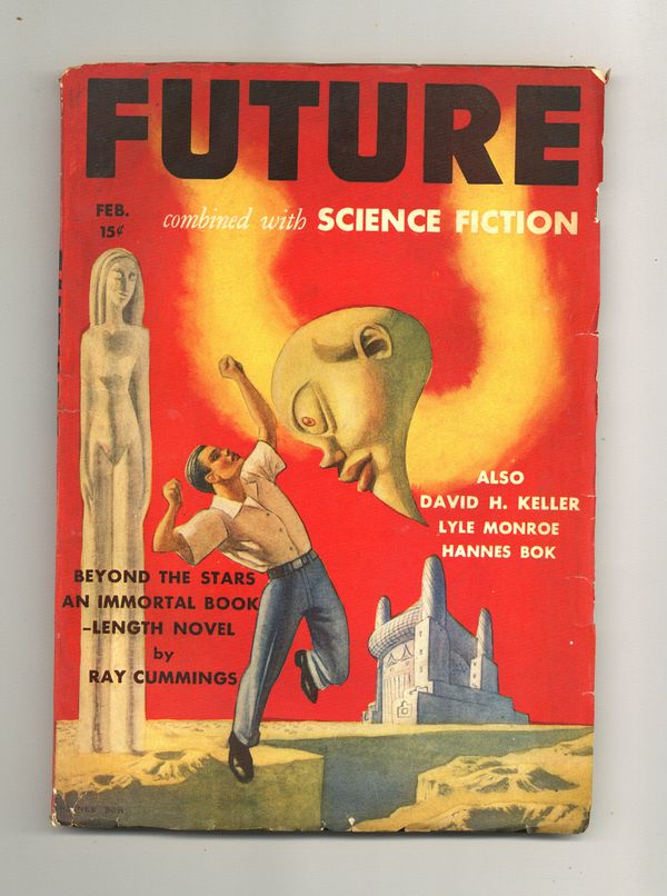 February, 1942. Previously titled Future Fiction. Cover by John R. Forte, Jr. "Once in a Blue Moon" by Norman L. Knight. Other stories by Ray Cummings, Martin Pearson, Joseph Gilbert, Hugh Raymond, E. A Grosser, J. S. Kilmaris, Wilfred Owen Morley, James Blish, and Mallory Kent. 7-in. x 10-in., black and white; 114 newsprint pages. Cover price $0.15.