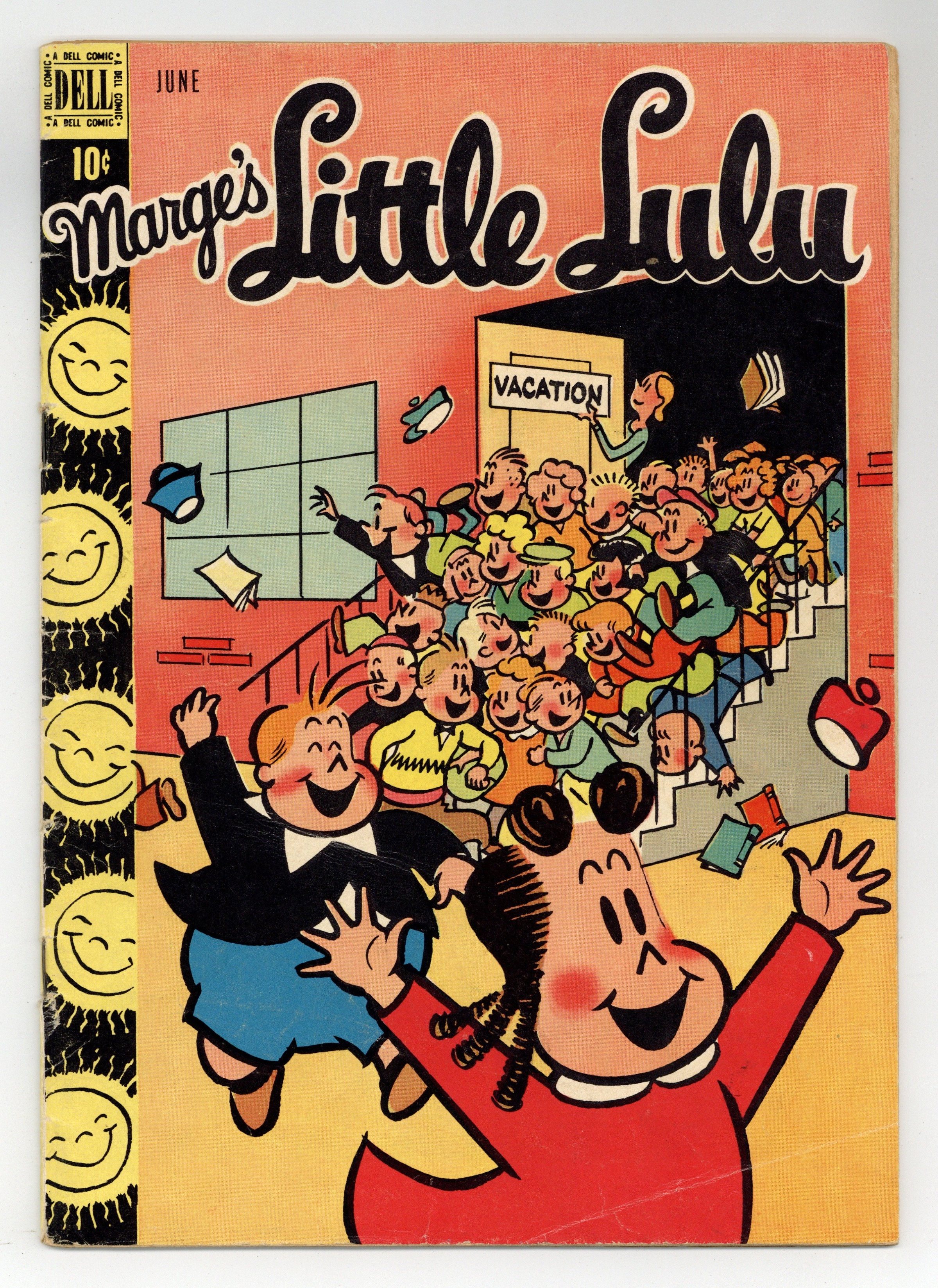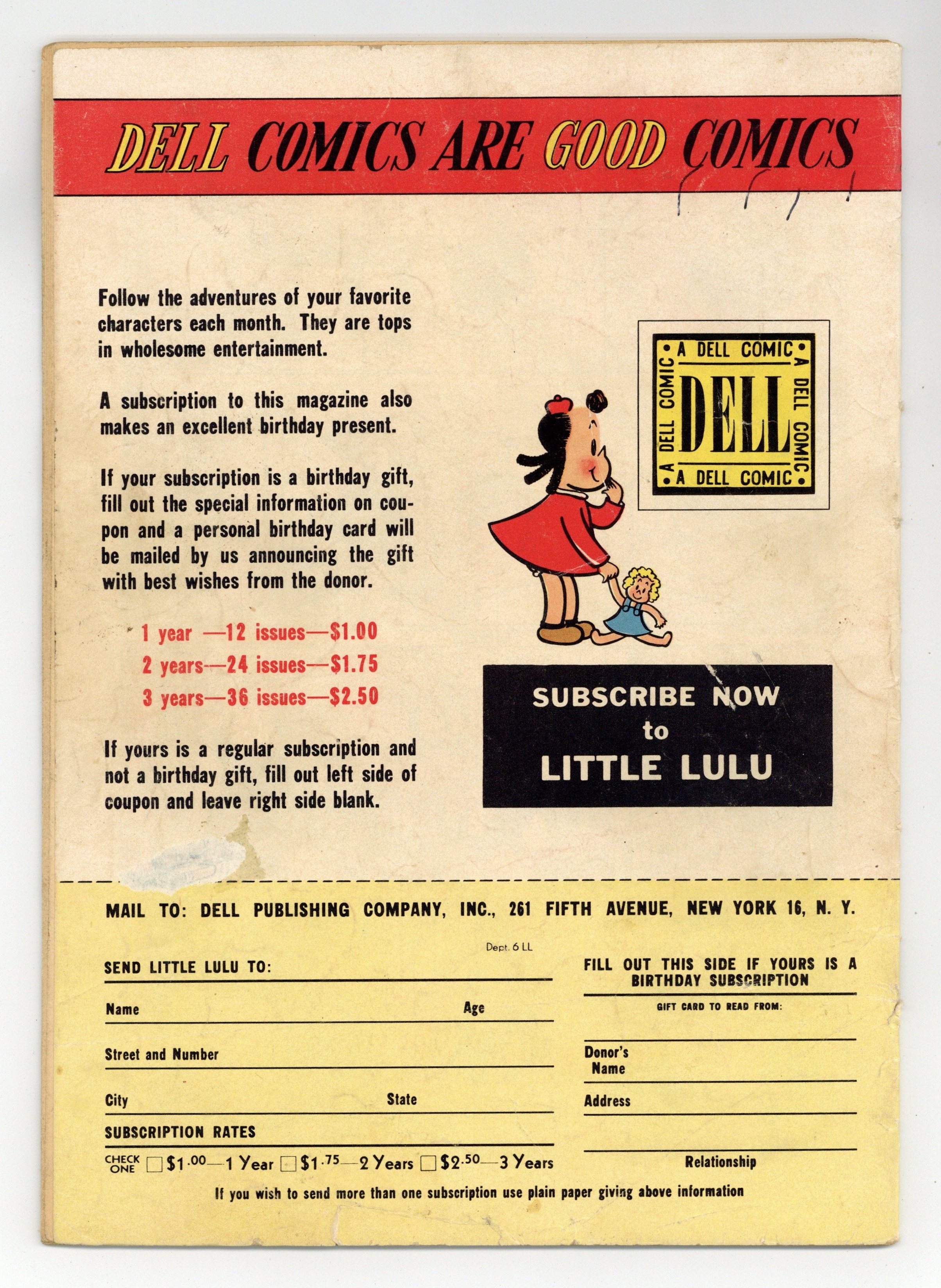 Canadian Edition. Reprints Little Lulu (1948-1980 Dell/Gold Key) #12. Cover art by Irving Tripp. The Sea Dogs; The Fellers trick Lulu into providing the lunch for their picnic on Wigwam Island. Fifty-Fifty Proposition; Lulu and Tubby go halves on a model airplane for a contest. The Green Girl; Lulu's mother takes Lulu to the doctor after her skin mysteriously turns green. Tubby's Revenge; Tubby's kite string becomes entangled on a television aerial. All scripts by John Stanley, art by Irving Tripp. 36 pages, full color. Cover price $0.10.