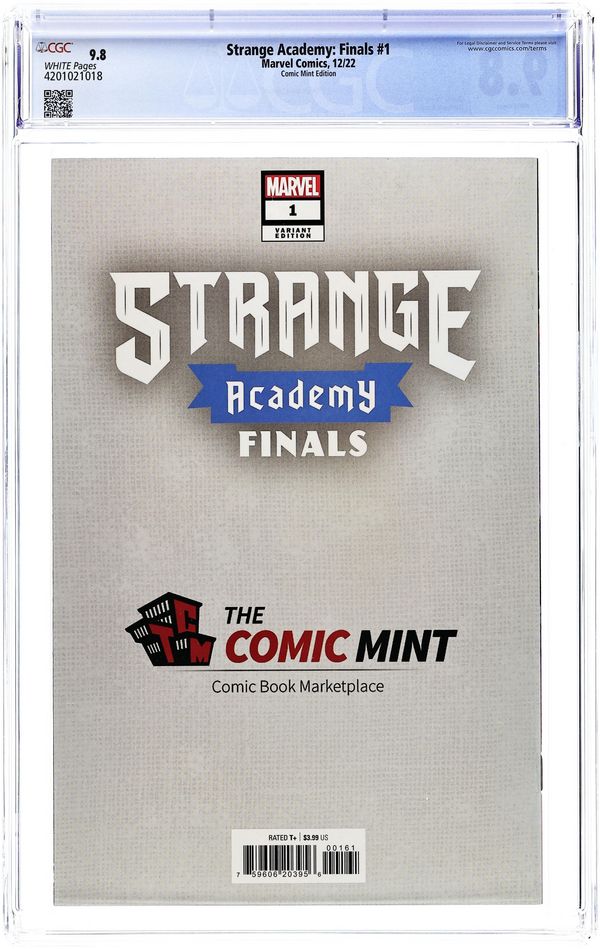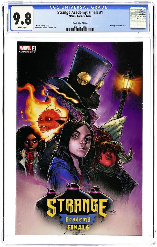 Comic Mint Edition Cover by Humberto Ramos. Written by Skottie Young. Art by Humberto Ramos. FRESHMAN YEAR IS ALMOST OVER! From day one, people have been wondering - who is the savior of Strange Academy, and who can bring it all down? The future of Marvel Magic is going to be decided here and it will take FAR more than the Sorcerer Supreme and his school if magic has a chance!, rated T+
