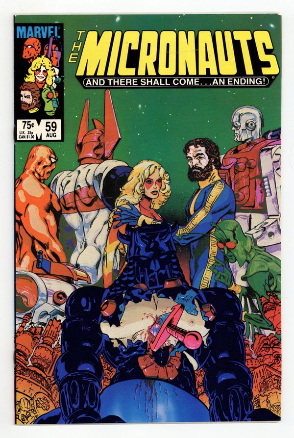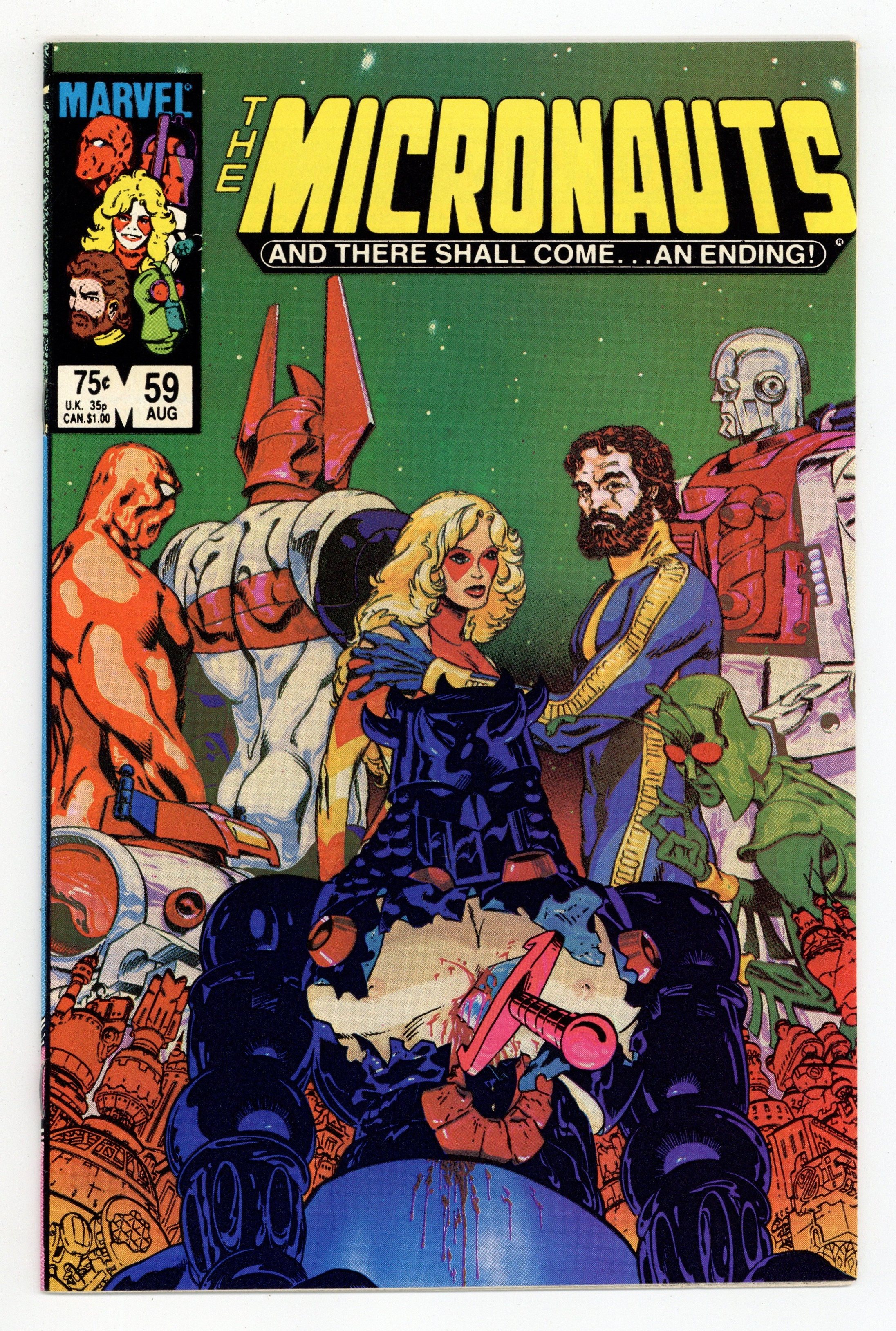 Beginning a new direction for the 'Nauts! You'll meet a being older than the very Microverse, and itch with anticipation at the mystery of...The Makers! If that's not enough, we're gonna hint at some shocking changes for Huntarr, and a brand new creative team! Note: continued in Micronauts The New Voyages (1984) #1. "Homeworld" is written by Peter B. Gillis, with art by Kelley Jones and Bruce Patterson. Cover by Michael Golden. Cover price $0.75.