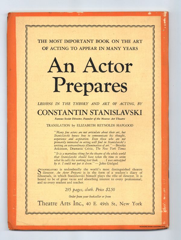 Published Aug 1937 by Theatre Arts, Inc..$17.00- Spine split 5%. Staple rust: Moderate.