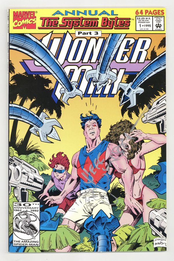 The System Bytes. Part 3 of 4. "To The Max" Script by Gerard Jones. Pencils by Darick Robertson. Inks by Ian Akin. Cover by Jeff Johnson and Terry Austin. Story continues from Daredevil (1964 1st series) Annual #8. While filming a beer commercial on a Pacific island, Wonder Man encounters a cyber-villain that has taken over a defunct Hydra base! The computer virus called Max wants to seize control of the national air defense system by launching a satellite into space! However Simon cannot let that happen! Will Wonder Man be able to stop the launch and save the lives of Ginger and Spider along the way? All in a day's work for the Hollywood avenger! Story concludes in Guardians of the Galaxy (1991 1st series) Annual #2. Second story: "My Ten Worst Villains" Script by Kurt Busiek. Art by Art Nichols. Simon reviews his rogues' gallery while receiving an Oscar! Cameo appearance by Alex Flores. Third story: "Selling The War" Script by Gerard Jones. Pencils by Stuart Immonen. Inks by Ron Boyd. Neal Saroyan tries to convince Alex Flores to write a movie script about Operation Galactic Storm! Appearance by Jamie Flores. Fourth feature: One-page pin-up of Wonder Man arm wrestling the Juggernaut by Jeff Johnson and Jimmy Palmiotti. Fifth feature: One-page pin-up of Wonder Man and Ginger Beach by Jeff Johnson and Michael Bair. (Note: Splash page art by Darick Robertson and Ian Akin.) 64 pages. Cover price $2.25.
