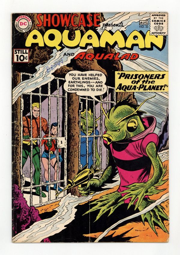 Starts Jan 26 Cover pencils by Dick Dillin, inks by Sheldon Moldoff. Prisoners of the Aqua-Planet starring Aquaman, Aqualad, and Mermor. Aquaman and Aqualad meet Mermor, an alien from Venus who was driven to Earth by the tyrant Naeco. The Alien Creature Ambush; Aquaman and Aqualad are captured along with Mermor and taken to Venus. King of the Land Creatures; Aquaman helps Mermor and his followers in overthrowing the tyrant Naeco. Scripts by Jack Miller, art by Nick Cardy. 36 Pages, Full Color. Cover price $0.10.