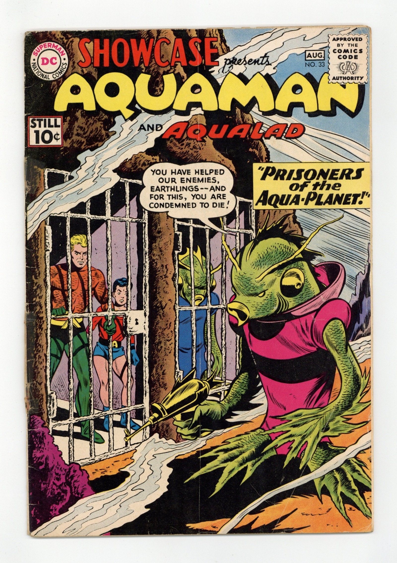 Cover pencils by Dick Dillin, inks by Sheldon Moldoff. Prisoners of the Aqua-Planet starring Aquaman, Aqualad, and Mermor. Aquaman and Aqualad meet Mermor, an alien from Venus who was driven to Earth by the tyrant Naeco. The Alien Creature Ambush; Aquaman and Aqualad are captured along with Mermor and taken to Venus. King of the Land Creatures; Aquaman helps Mermor and his followers in overthrowing the tyrant Naeco. Scripts by Jack Miller, art by Nick Cardy. 36 Pages, Full Color. Cover price $0.10.